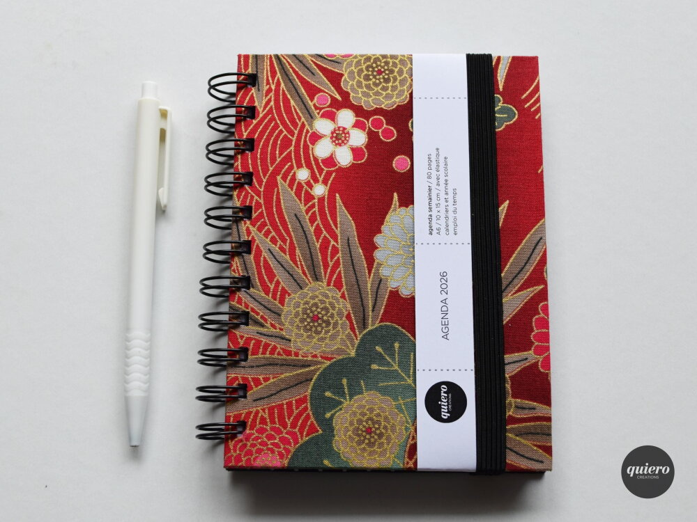 Agenda A6 2026 / Tissu Japonais Fleurs sur rouge / 10x15cm / pour la Rentrée / Idéal pour le sac à main