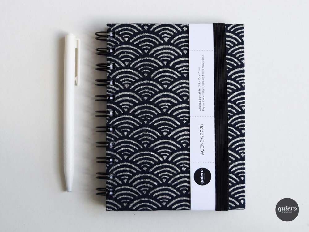 Agenda A6 2026 / Tissu Japonais Seigaiha, Bleu et Argent / 10x15cm / pour la Rentrée / Idéal pour le sac à main
