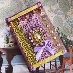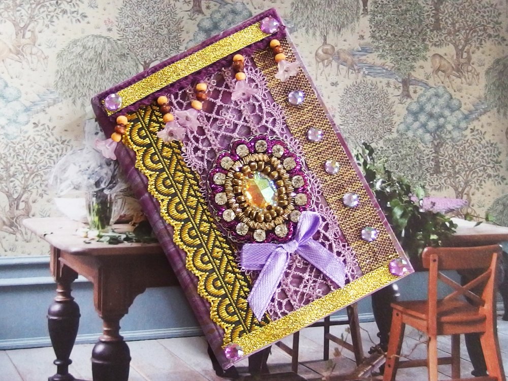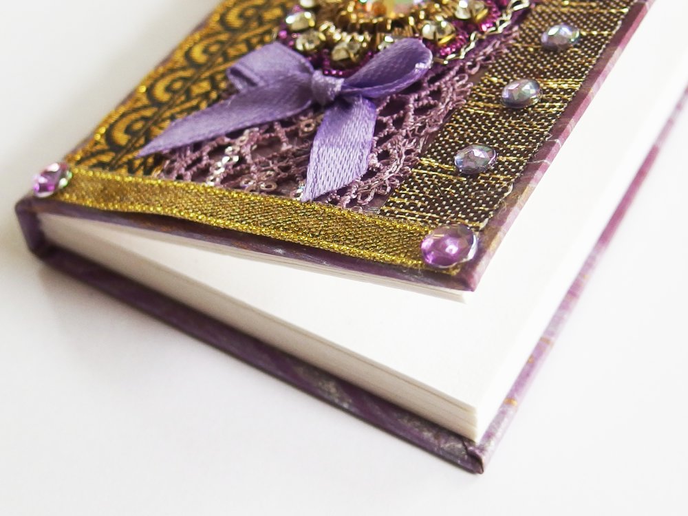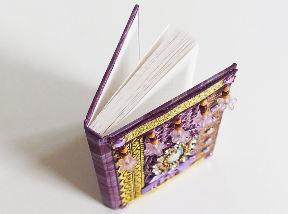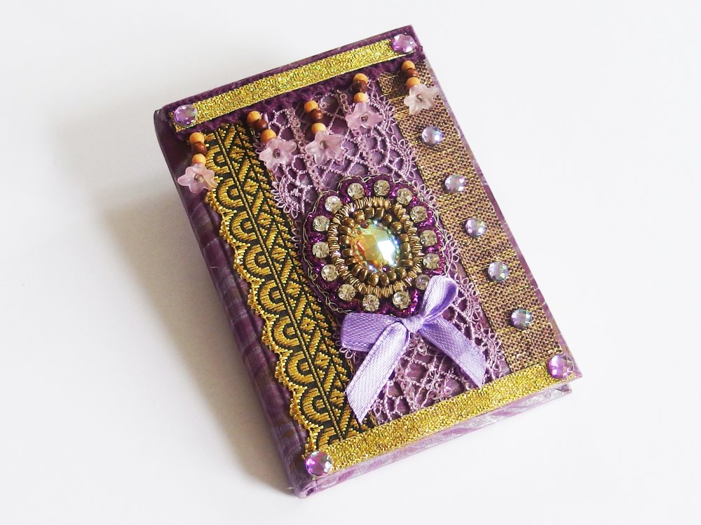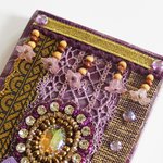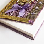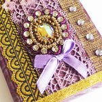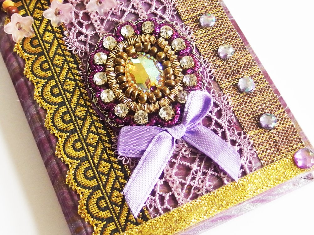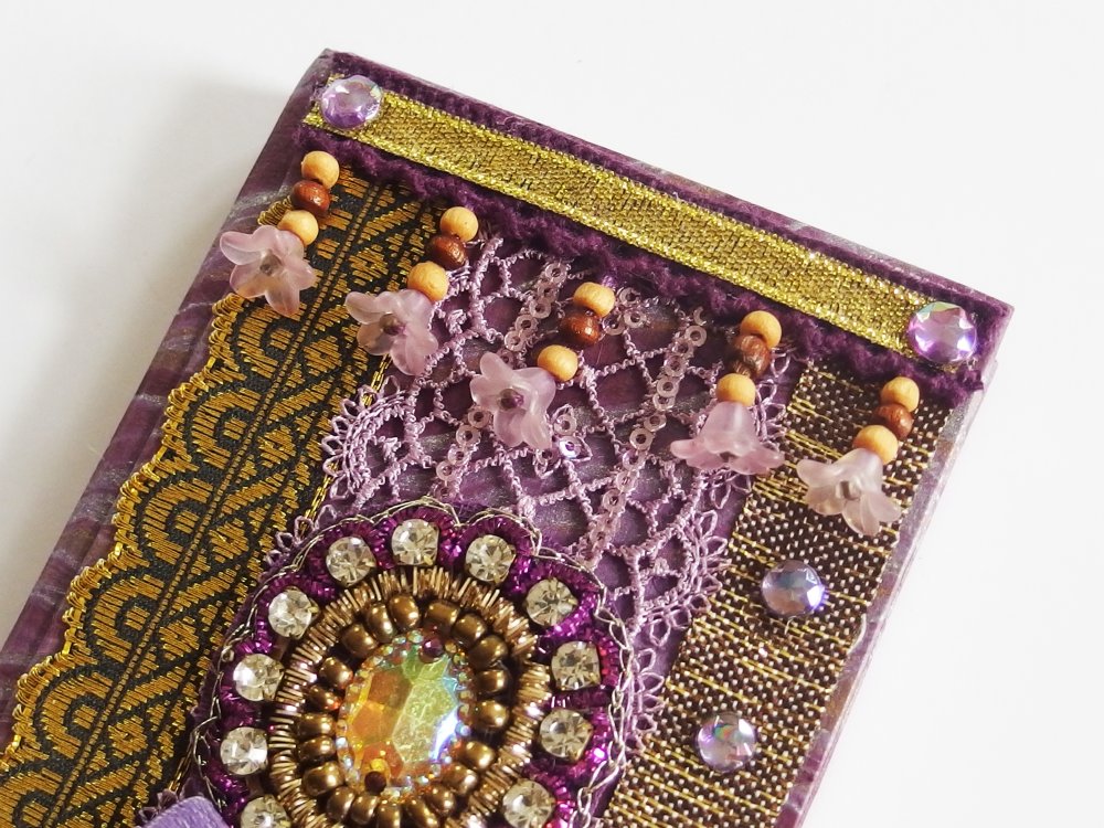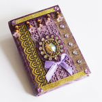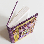 Sur la couverture, un papier reliure à la cuve couleur violet avec filets dorés et argentés, fabriqué à la main (sur les deux faces), agrémenté de riches passementeries Indiennes, dentelles orientales et strass. Un très joli cabochon avec strass et cannetille est installé au centre de ce bel environnement, agrémenté d'un petit noeud satin parme. Sur le haut du carnet, des pampilles-clochettes en liberté procurent légèreté et préciosité à cette création.