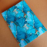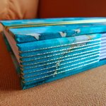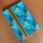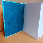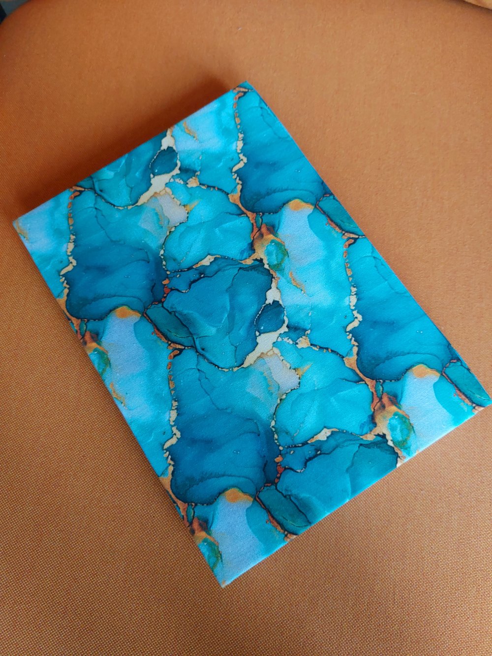 Sa couverture est rigide recouverte de tissu marbré bleu et jaune or agrémentée de ses deux rubans avec une ouverture apparente laissant apparaitre les pages reliées...