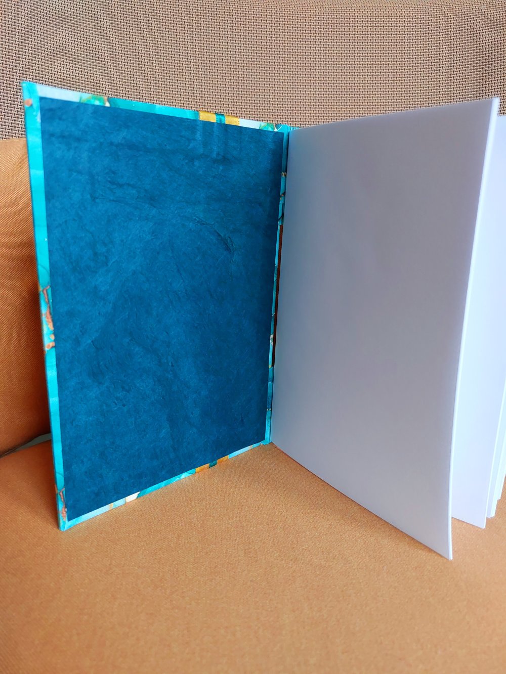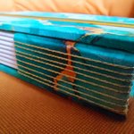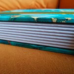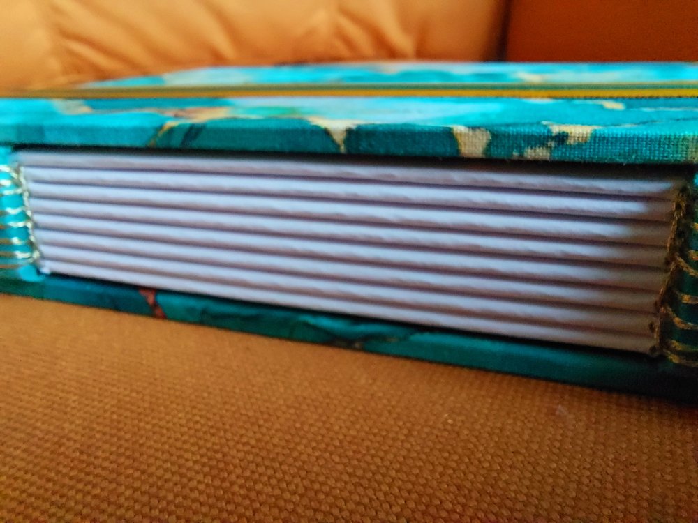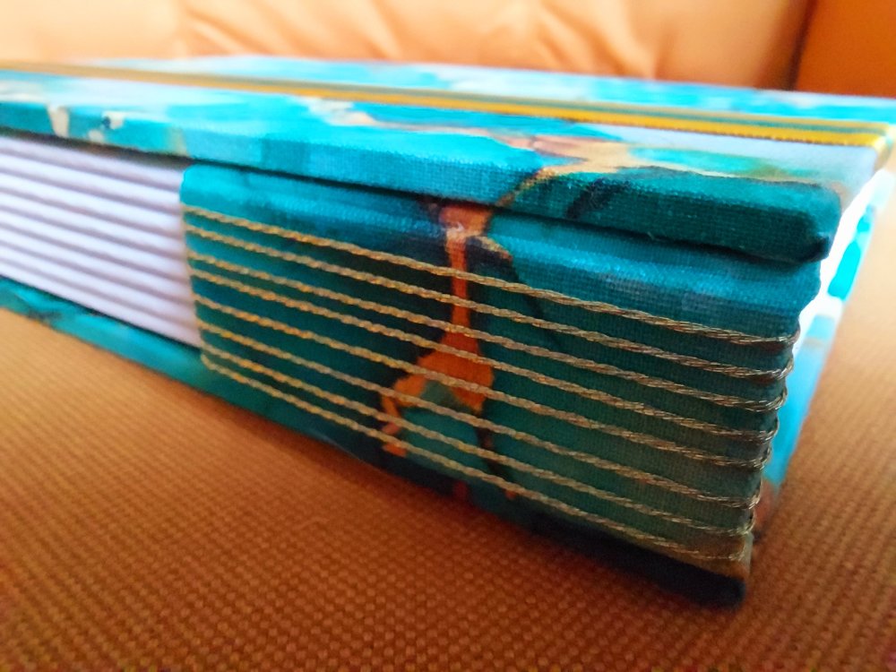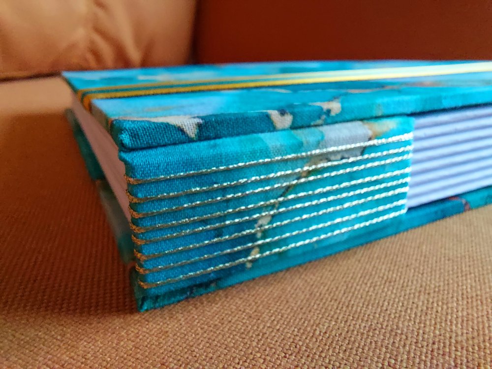 Le fil métallisé or coordonné met en valeur la reliure et le tissu.