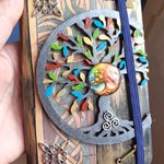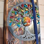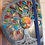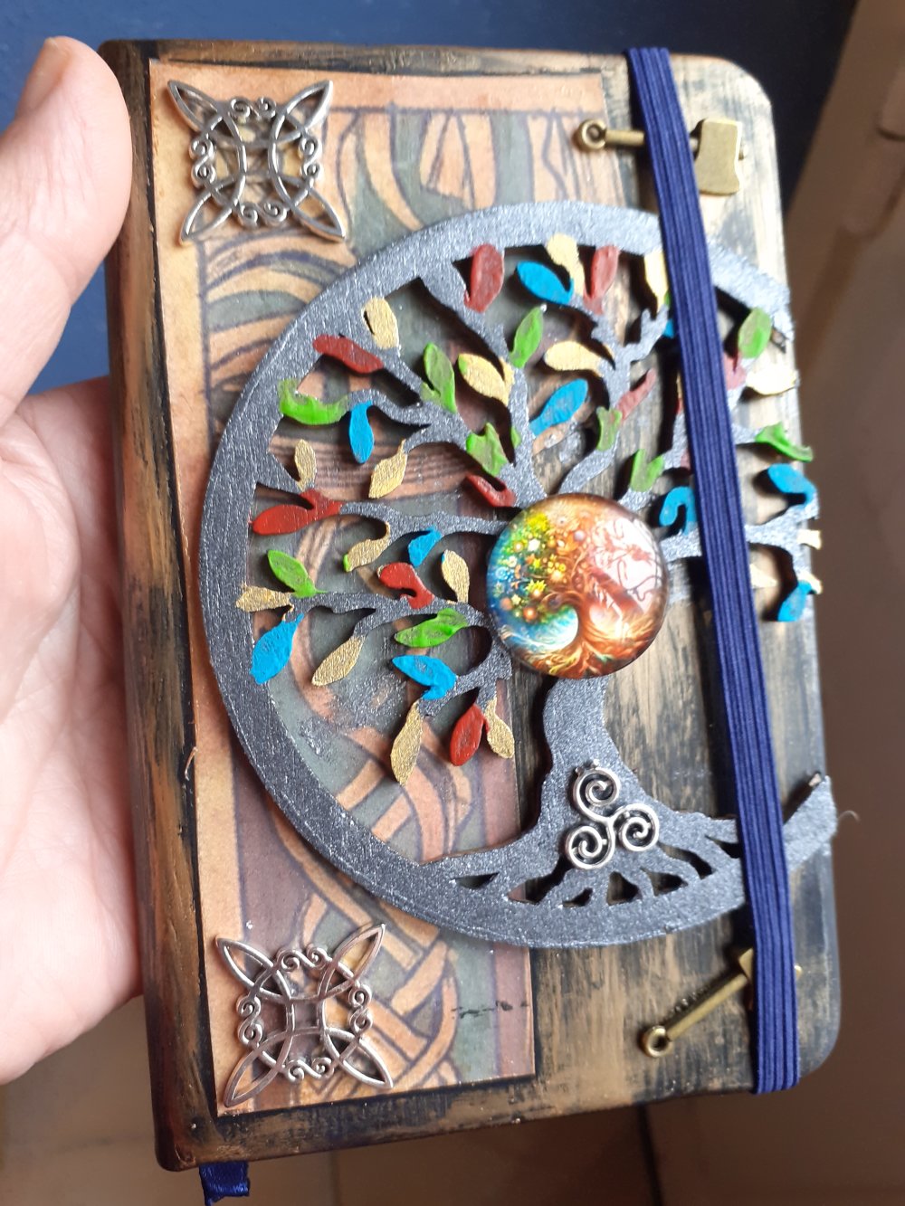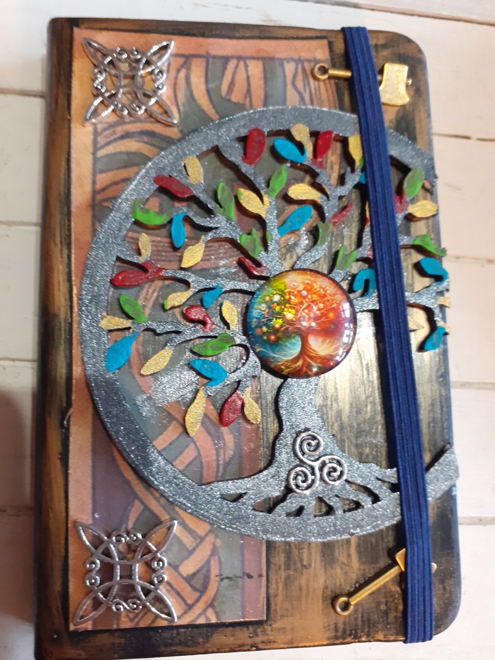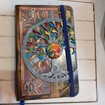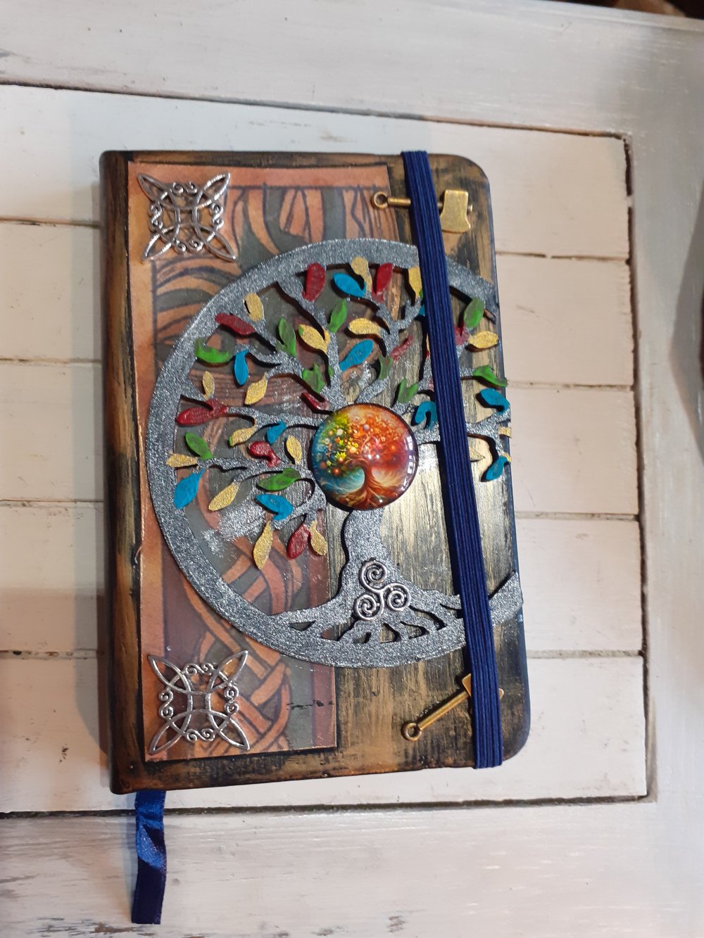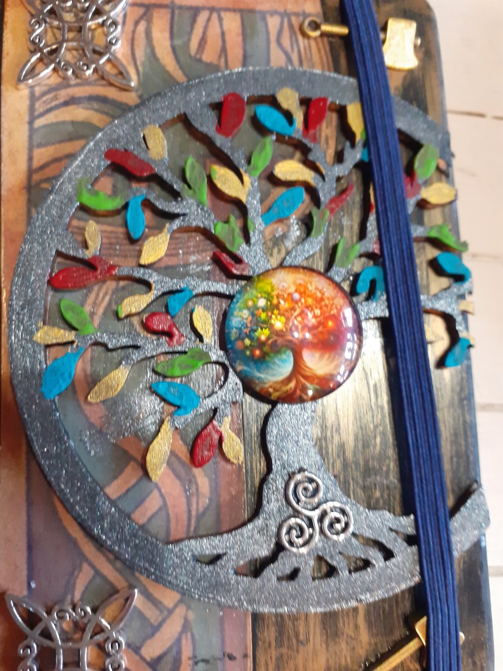 Ce carnet artisanal est décoré d’un arbre de vie coloré en relief, d’un cabochon lumineux et de motifs métalliques au style féérique et steampunk.