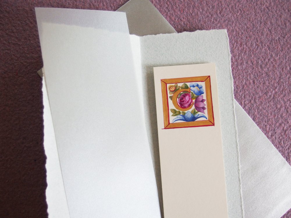 Le marque-page enluminure est livré glissé dans une belle pochette de papier artisanal fait-main, avec calque argenté de protection, le tout dans une enveloppe papier de qualité argenté.