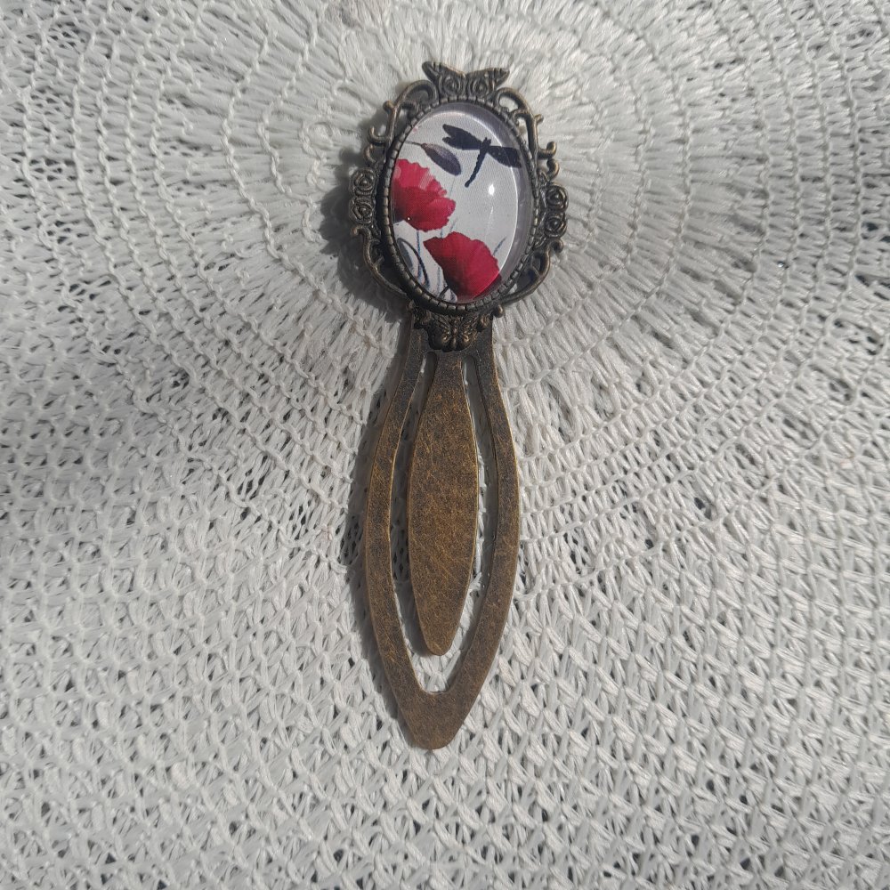 Marque page artisanal image de coquelicot et de libellule avec un cabochon de verre ovale.