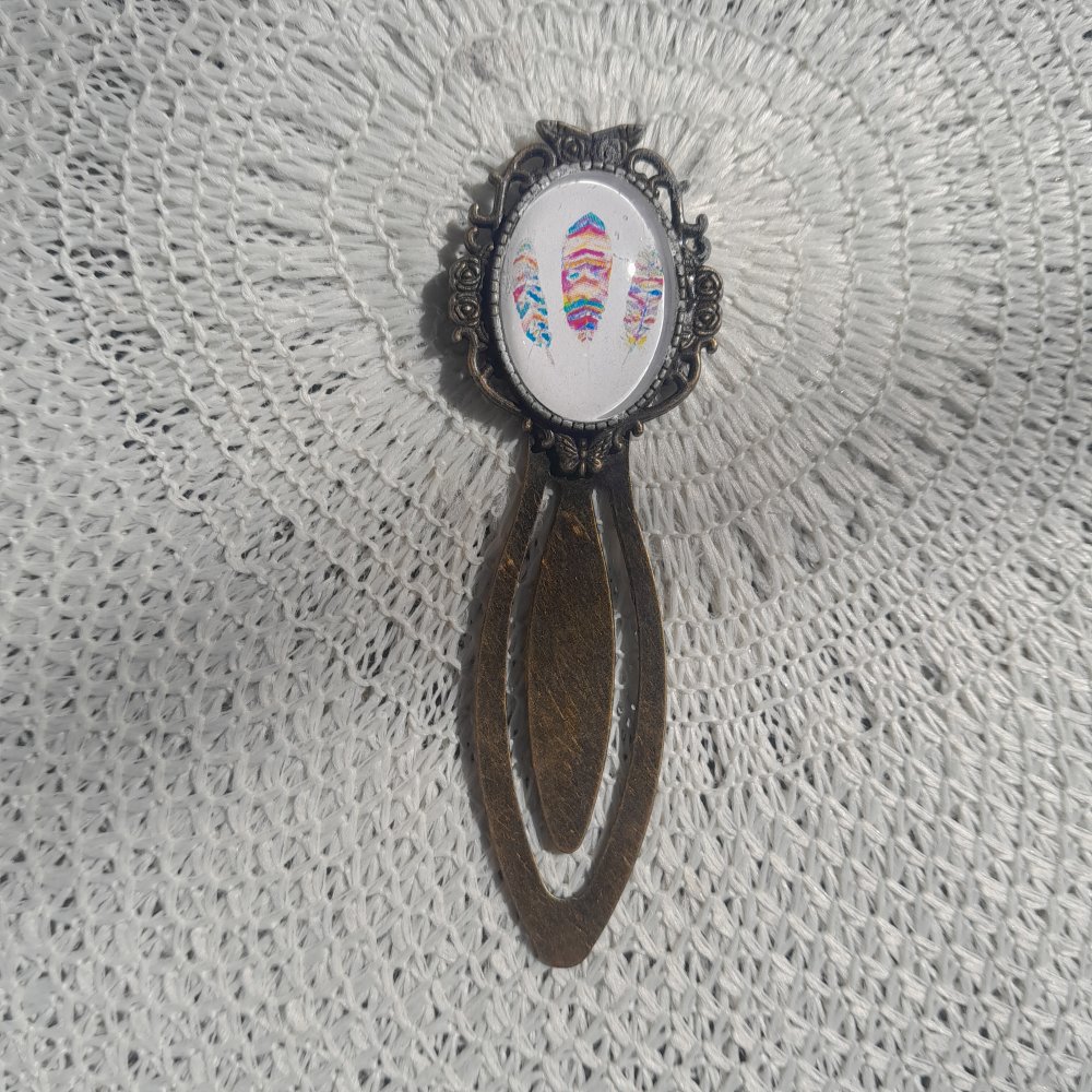 Marque page création artisanale avec une image de plume multicolore et un cabochon de verre.