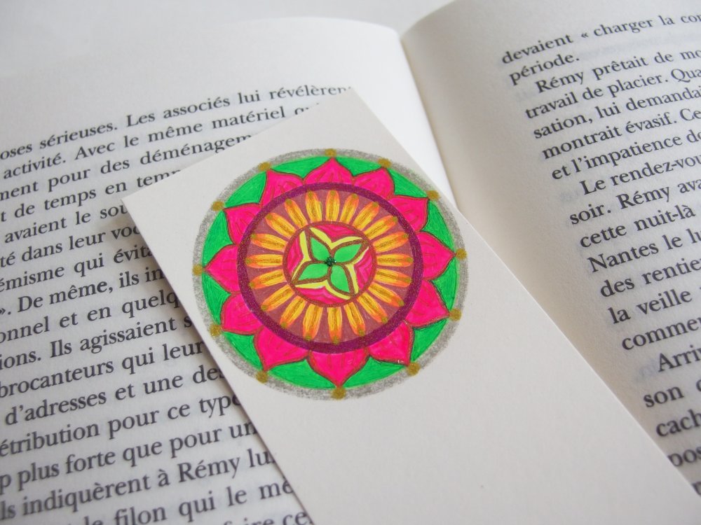 Le marque-page est façonné dans un papier couché mat de qualité offrant une texture et un aspect satiné, couleur crème blanc-cassé. Le mandala est réalisé au stylo-gel, résistant à la lumière, avec quelques points brillants et pailletés. Très belle luminosité.