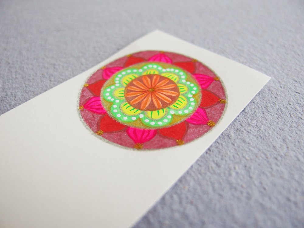 Le marque-page est façonné dans un papier couché mat de qualité offrant une texture et un aspect satiné, couleur crème blanc-cassé. Le mandala est réalisé au stylo-gel, résistant à la lumière, avec quelques points brillants et pailletés. Très belle luminosité.