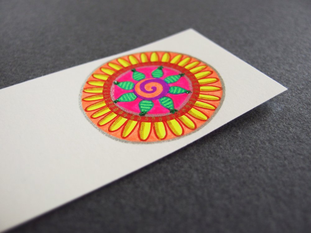 Le marque-page est façonné dans un papier couché mat de qualité offrant une texture et un aspect satiné, couleur crème blanc-cassé. Le mandala est réalisé au stylo-gel, résistant à la lumière, avec quelques points brillants et pailletés. Très belle luminosité.