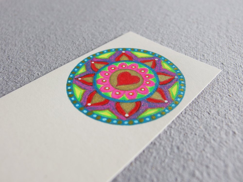 Le marque-page est façonné dans un papier couché mat de qualité offrant une texture et un aspect satiné, couleur crème blanc-cassé. Le mandala est réalisé au stylo-gel, résistant à la lumière, avec quelques points brillants et pailletés. Très belle luminosité.