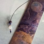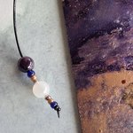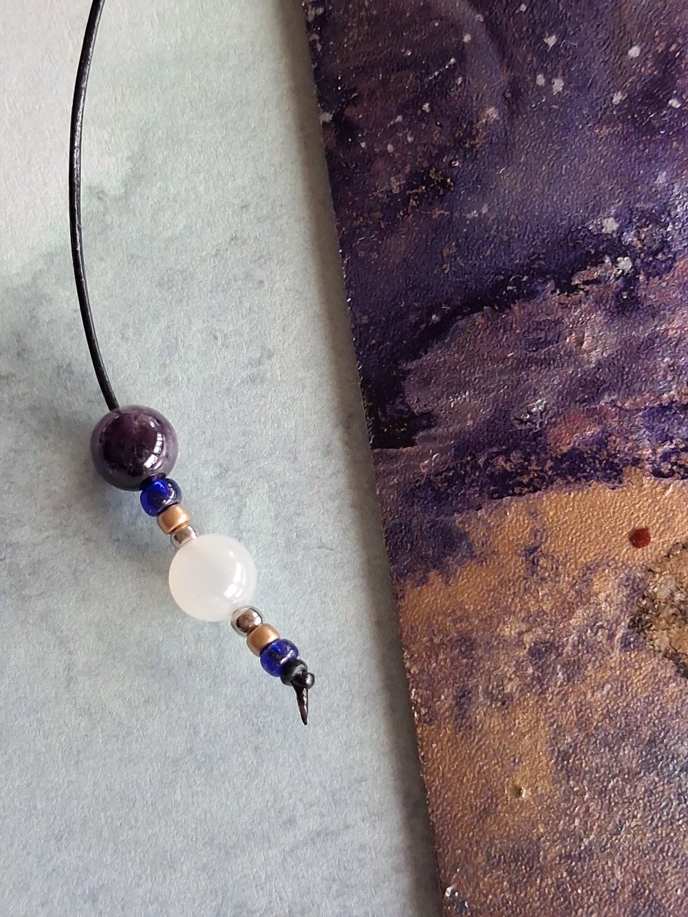le signet est un lacet de cuir noir, et de perles véritables: pierre de lune et améthyste.