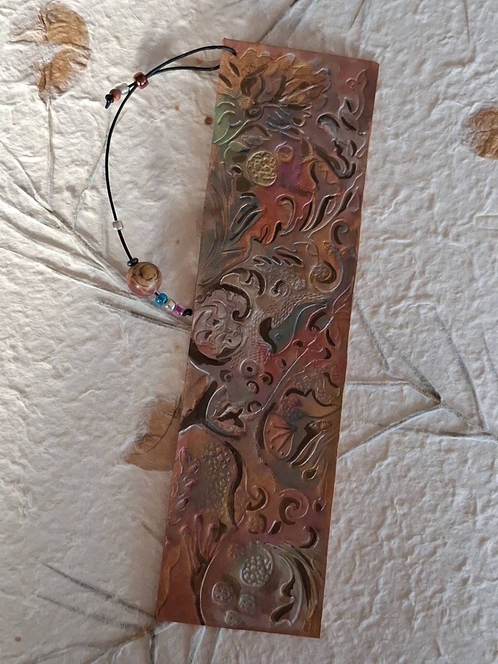 Marque page "volupté" est composé de plusieurs martelages et gravures créant une harmonie d'équilibres de volutes, les colories sont doux et irisées