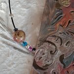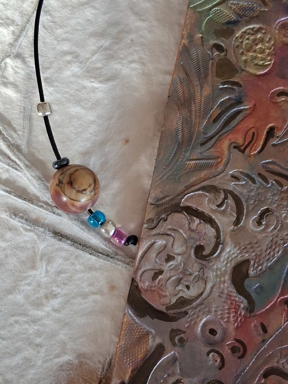 le signet est un lacet de cuir couleur noir ,de plusieurs perles en verre et pierre véritable