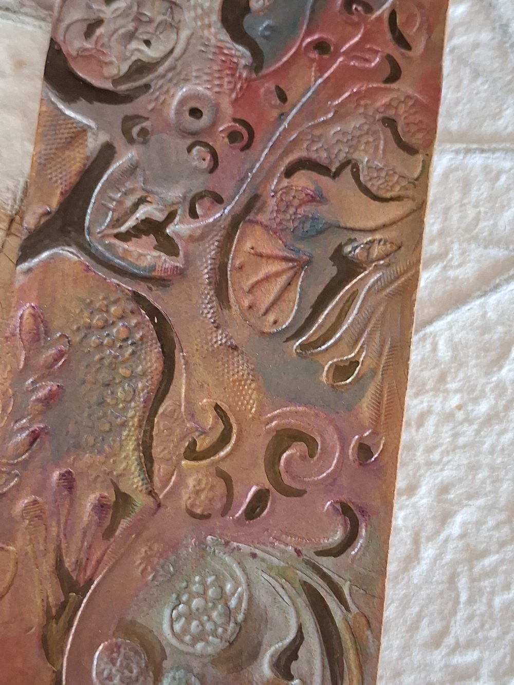 je recherche des colories par superposition, par mélanges et parfois, le hasard offre des tons très beau en des transparences, ou en aplats. Les marque-pages sont vernis pour protéger la peinture. Lorsque je recherche un brillant, je polis fortement le cuir . Là encore, je teste, je fais « ma cuisine »