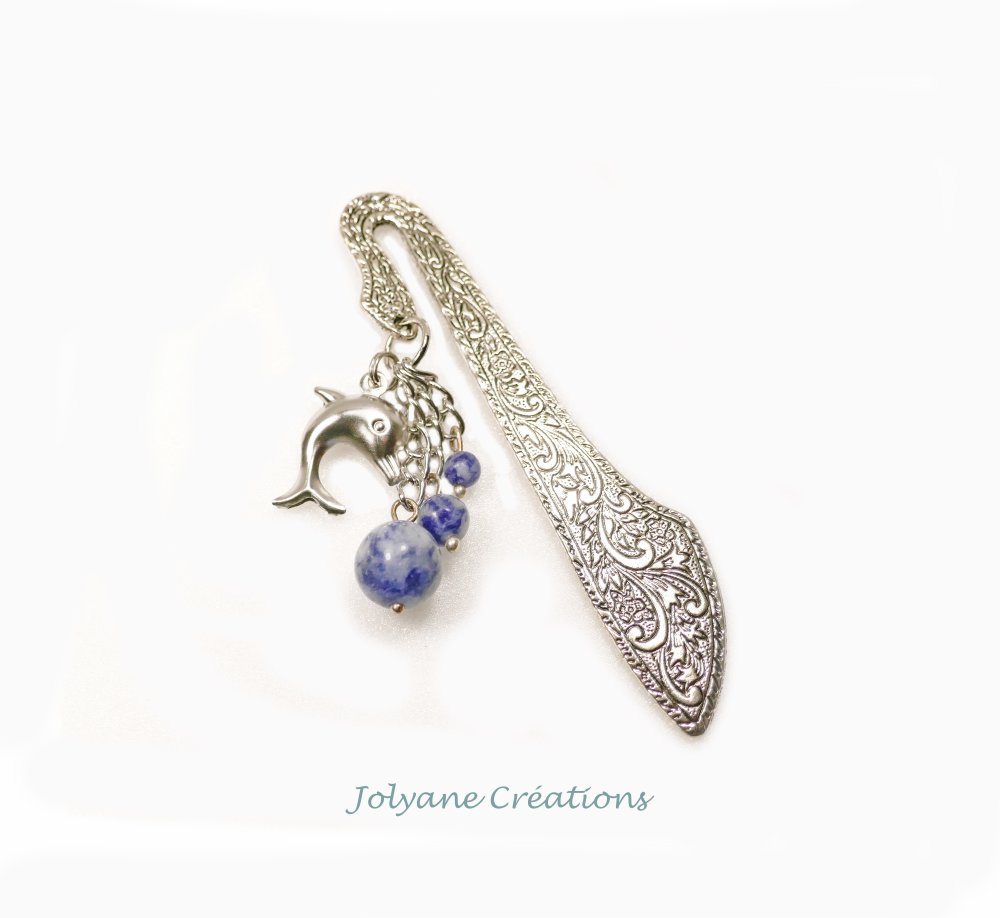 Marque-page ciselé de vaguelettes et animé de 3 perles en dumortiérite dans les tons bleu tacheté de gris avec son adorable dauphin 3D surfant au gré des vagues et jouant avec les balles dans un cliquetis délicat. Une idée cadeau originale