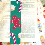 Apportez une touche de magie festive à vos lectures avec ce marque-page aux motifs de Noël. Illustré d’un adorable bonhomme en pain d’épices, de sucre d’orge et de petits cadeaux sur un fond vert sapin, il est parfait pour plonger dans l’ambiance chaleureuse des fêtes.