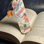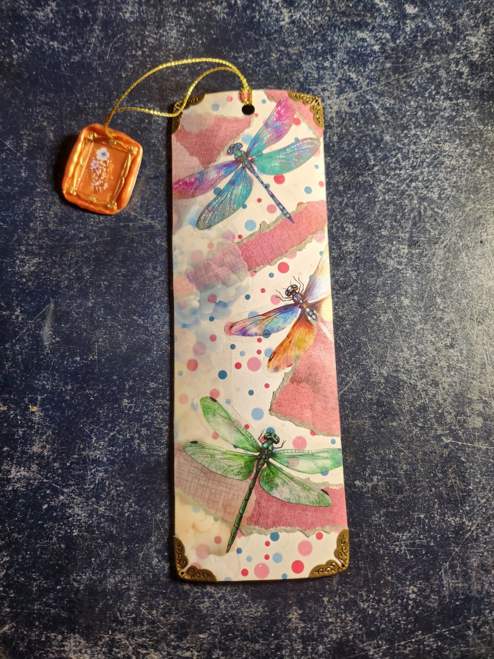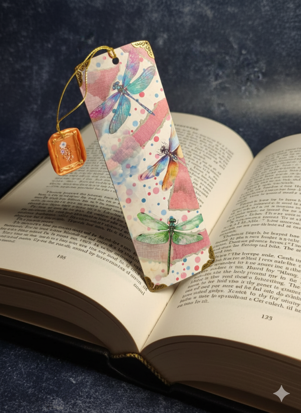 Marque-page artisanal unique mettant en avant des libellules dans les nuages. Finition mini cadre façon cire à cacheter