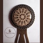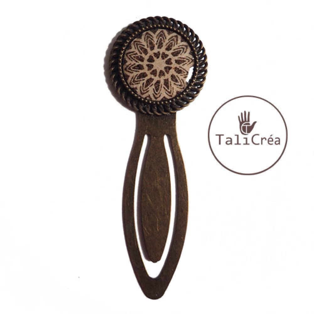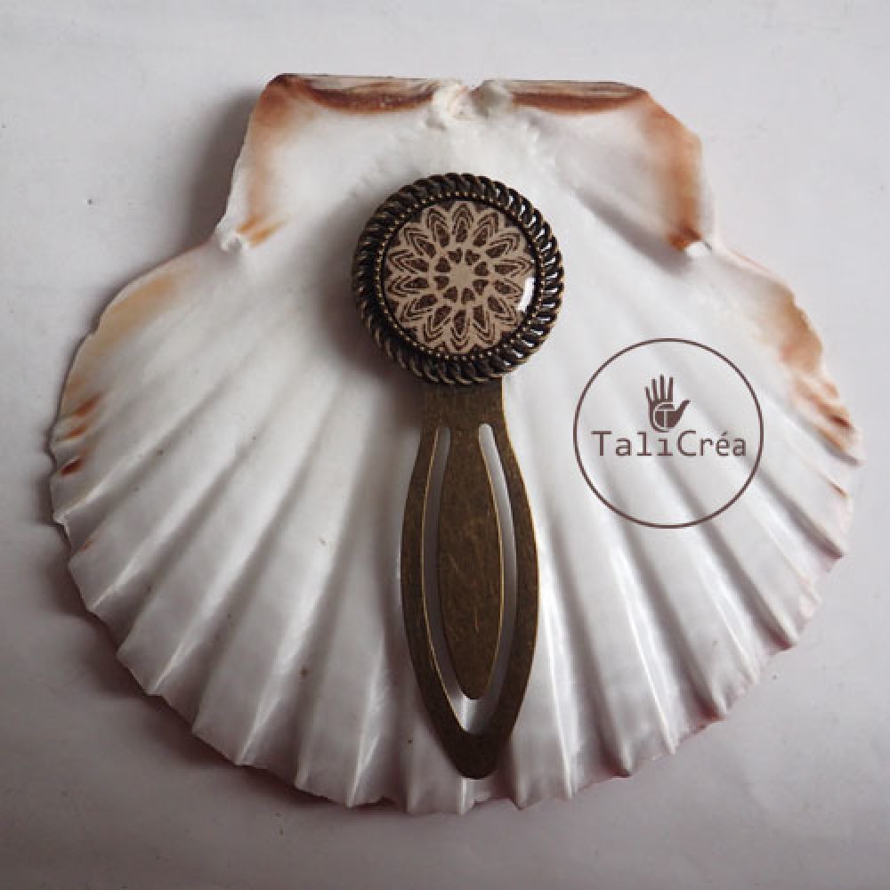 Un marque page en métal couleur bronze, avec un cabochon mandala en sables jaunes et marron.