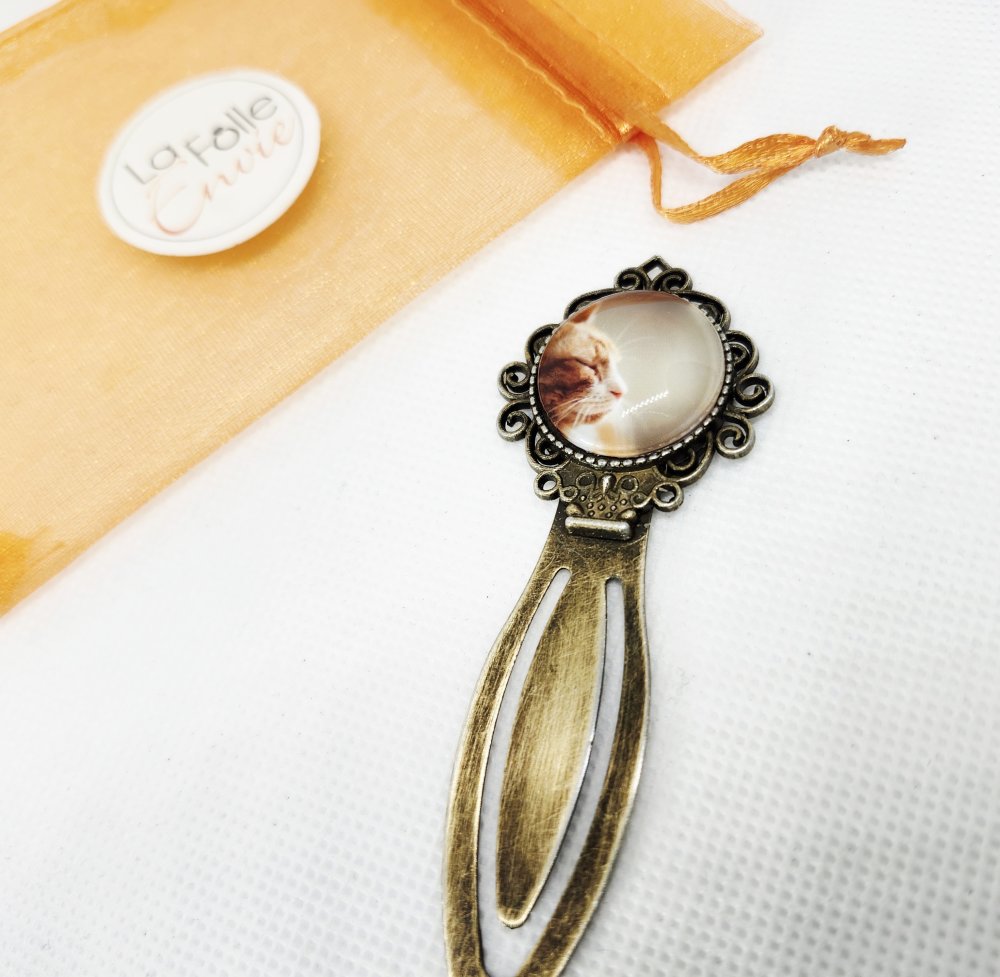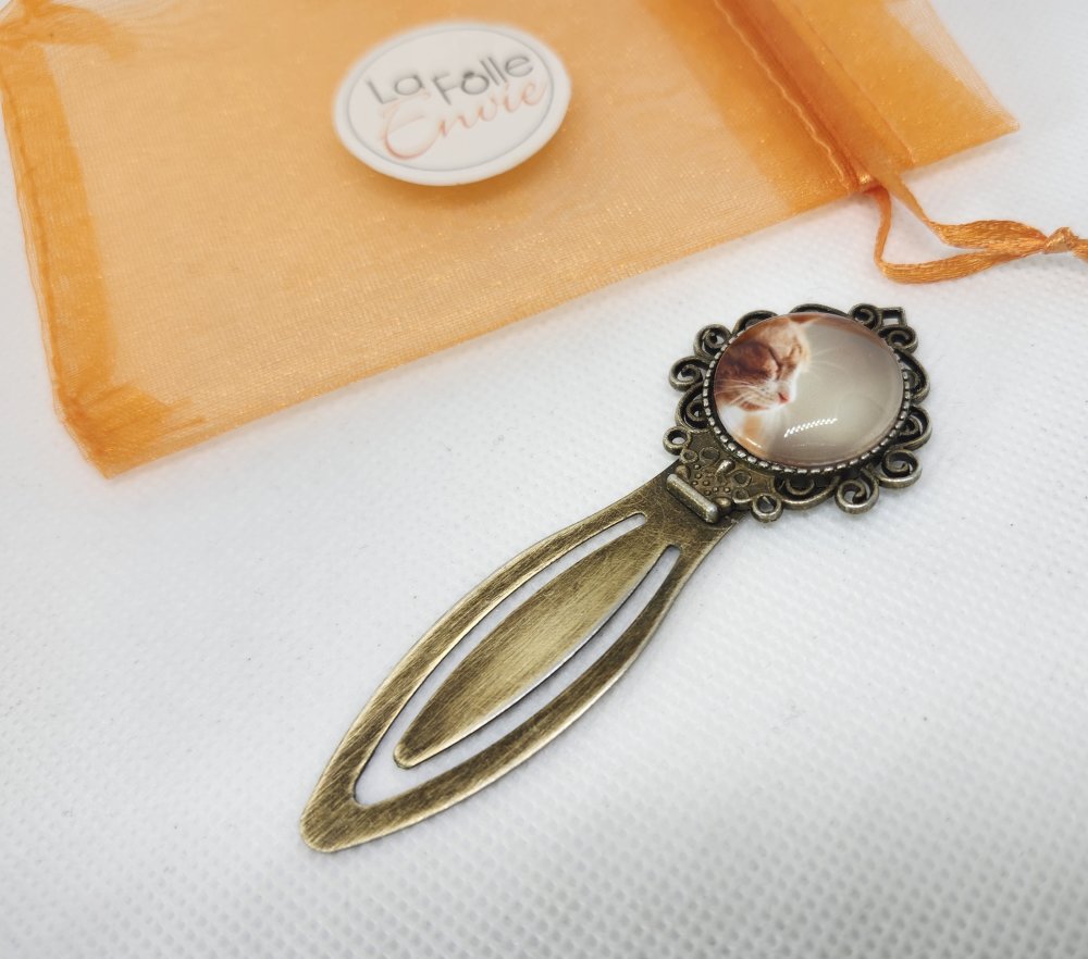 Je vous propose ce joli marque-page en métal couleur bronze antique et cabochon en verre 20mm. Motif chat roux. PIÈCE UNIQUE