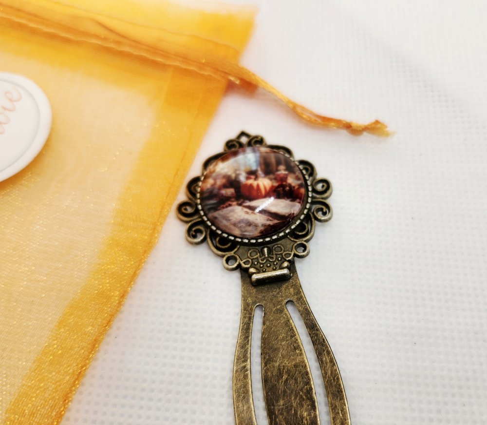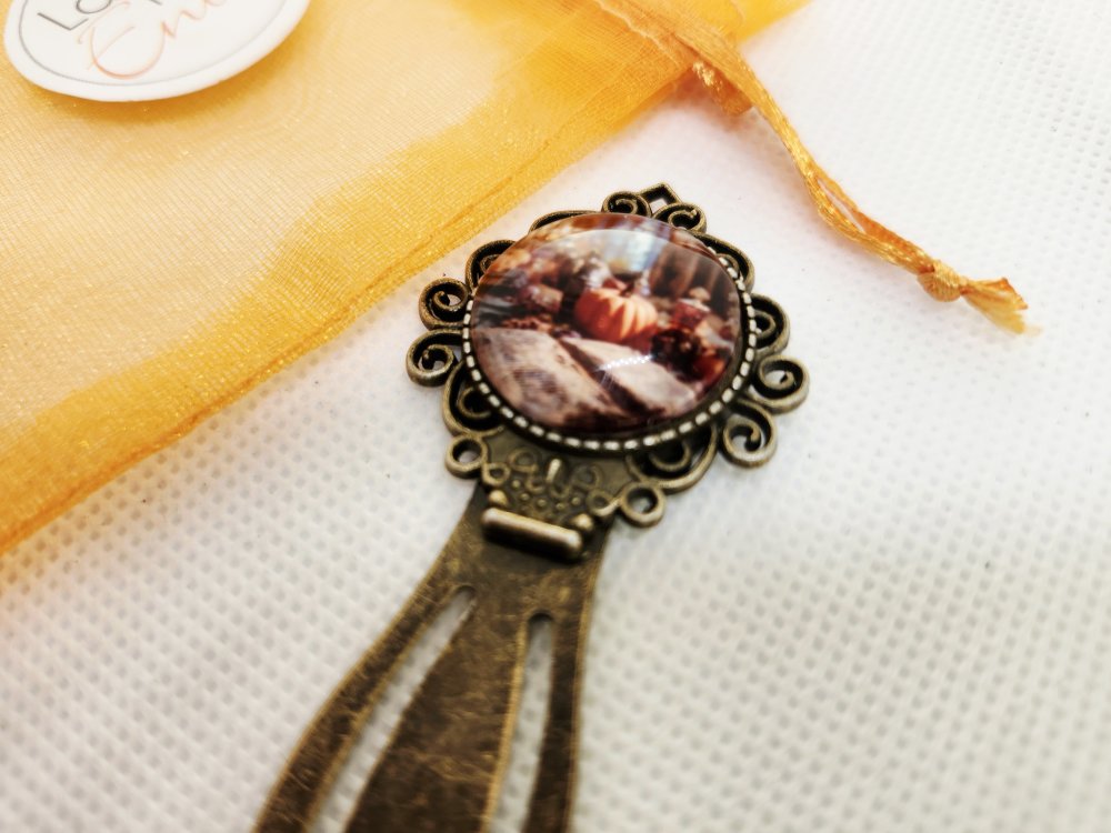 Marque-page métal cabochon verre motif citrouilles et grimoire