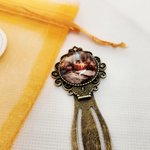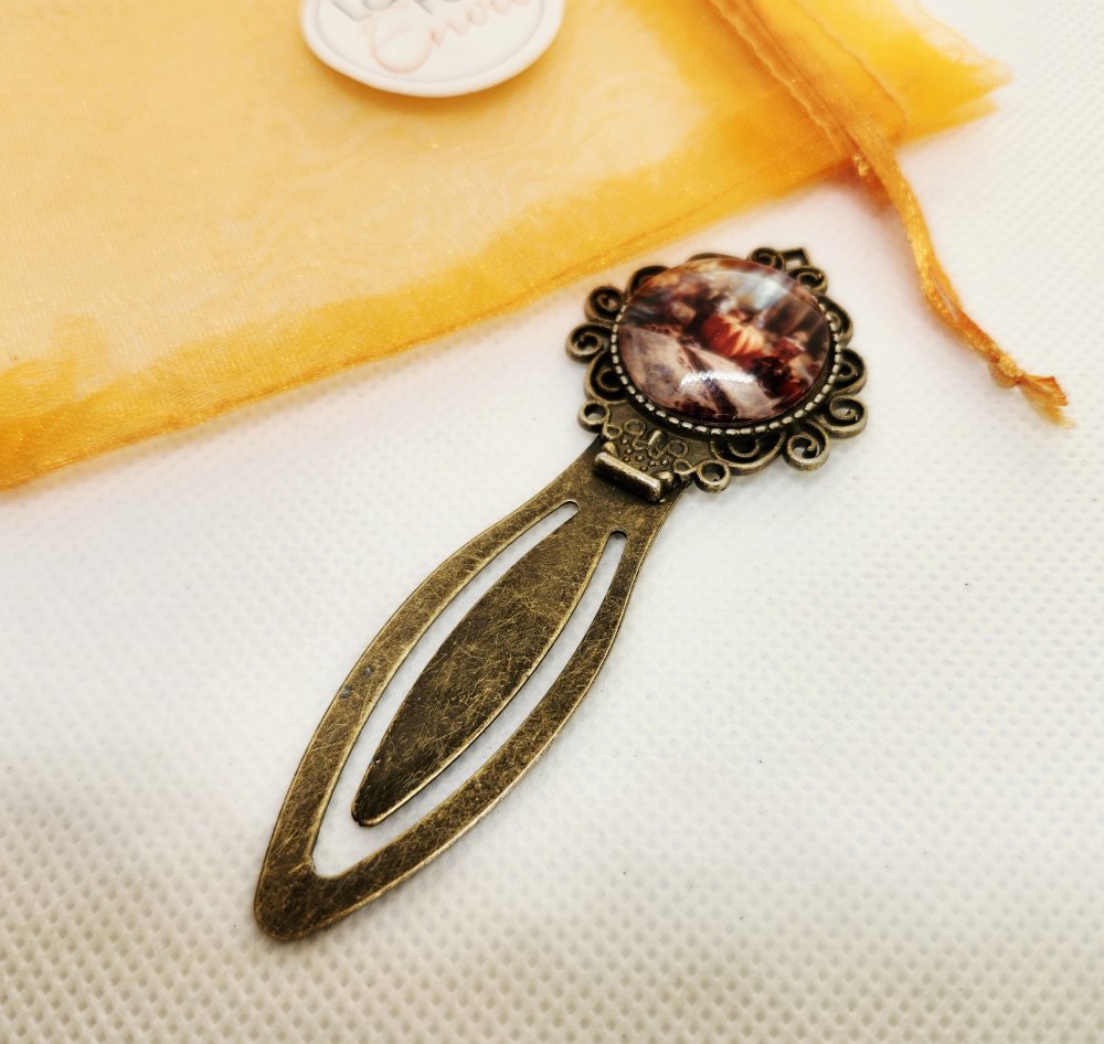Je vous propose ce joli marque-page en métal couleur bronze antique et cabochon en verre 20mm. Motif citrouilles et grimoire. Je réalise moi-même les cabochons en verre. PIÈCE UNIQUE