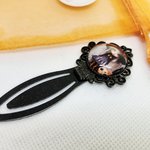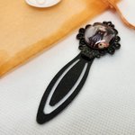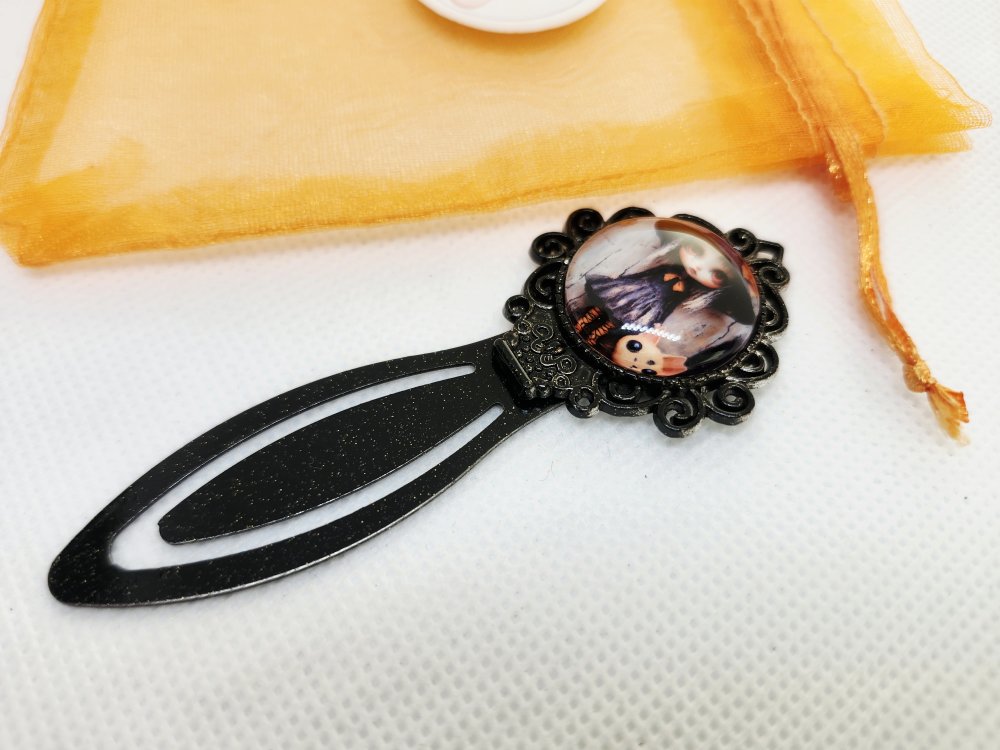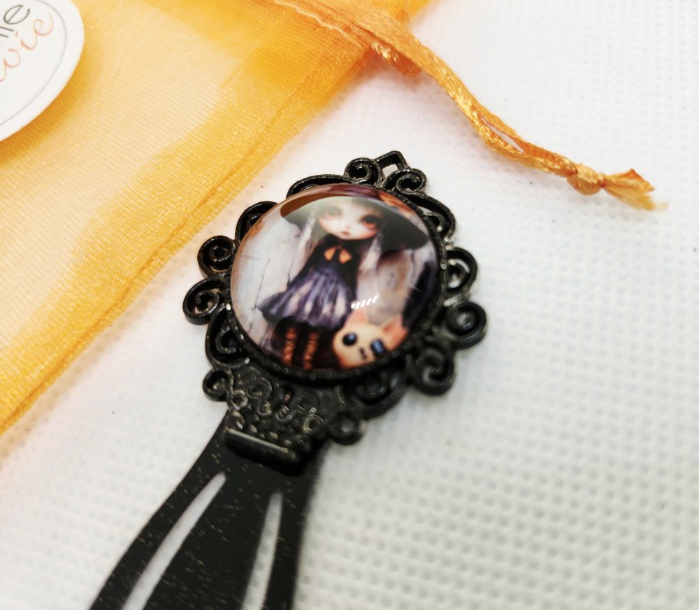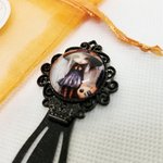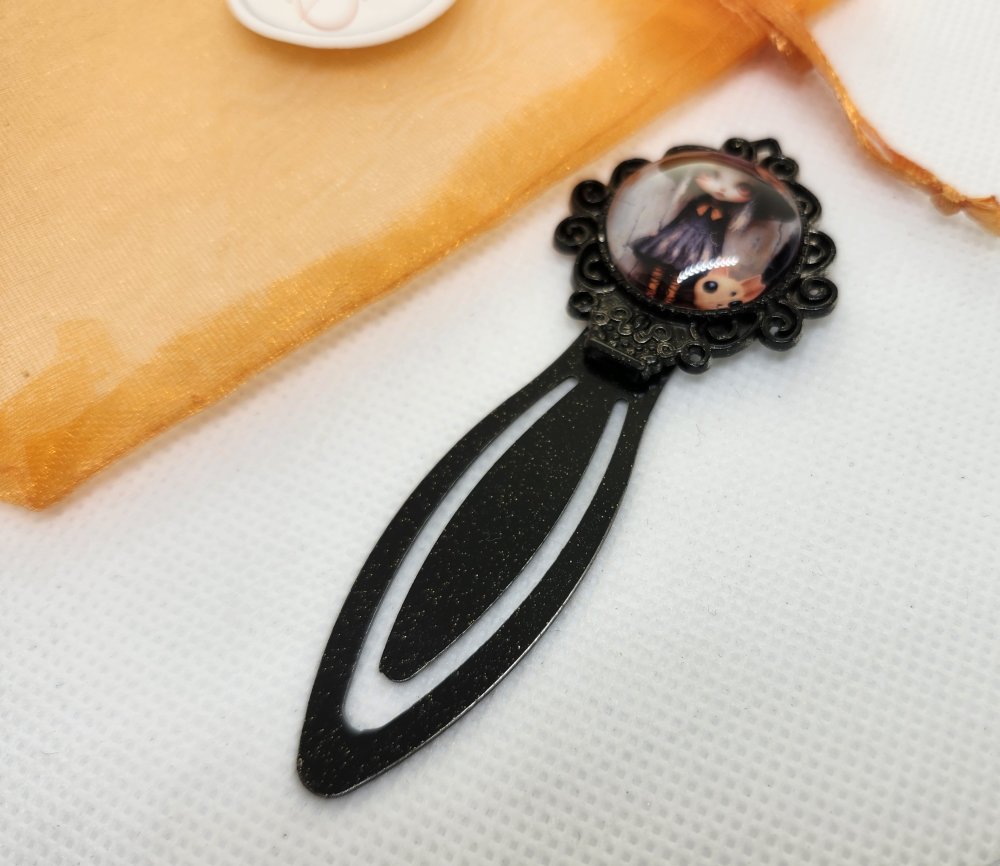 Je vous propose ce joli marque-page en métal couleur noir et pailleté et cabochon en verre 20mm. Motif sorcière et chat. Je réalise moi-même les cabochons en verre. PIÈCE UNIQUE