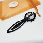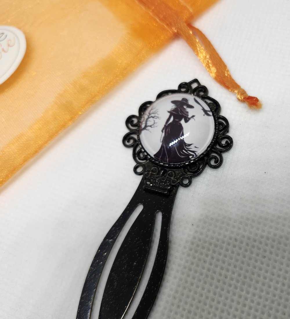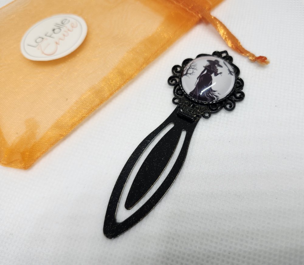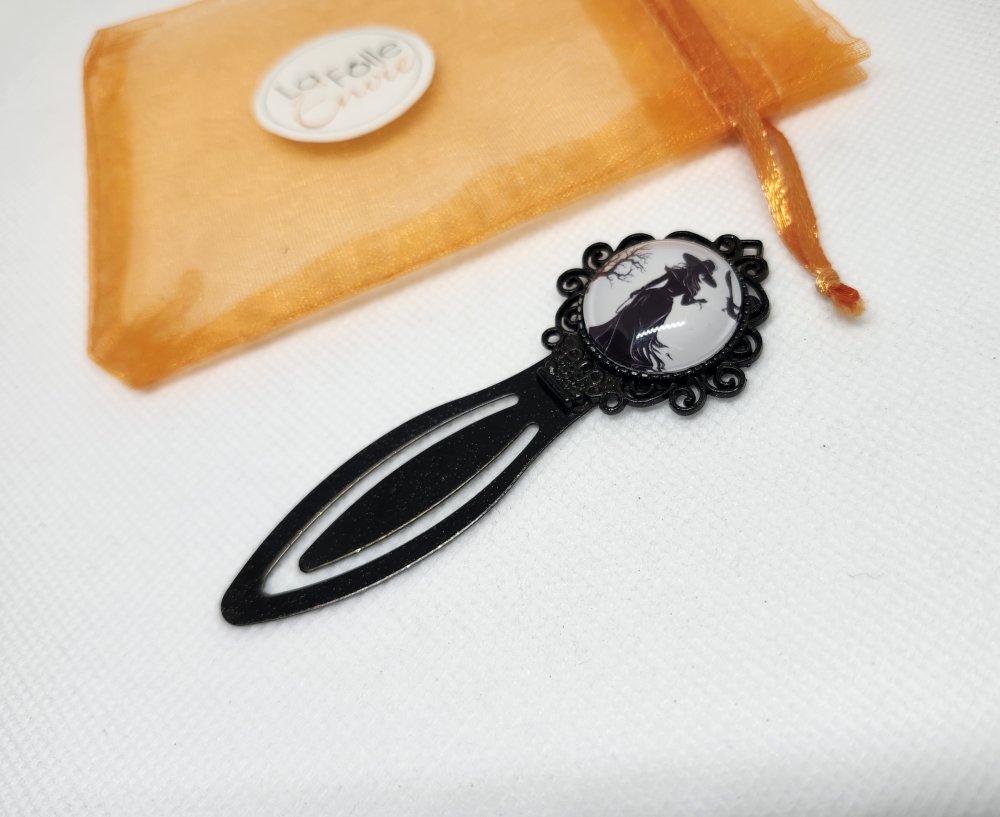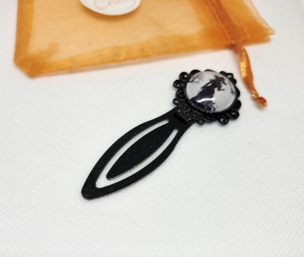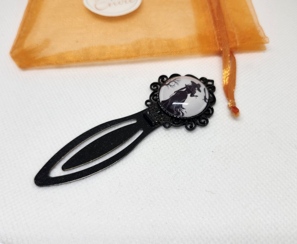 Je vous propose ce joli marque-page en métal couleur noir et pailleté et cabochon en verre 20mm. Motif sorcière noir et blanc. PIÈCE UNIQUE