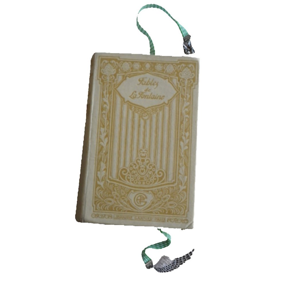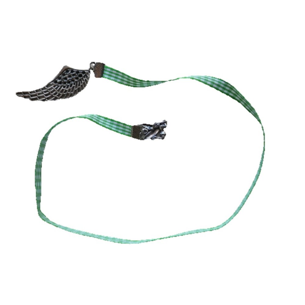 A chaque extrémité, une breloque en métal argenté : une grande aile d'un côté, une petite fée de l'autre