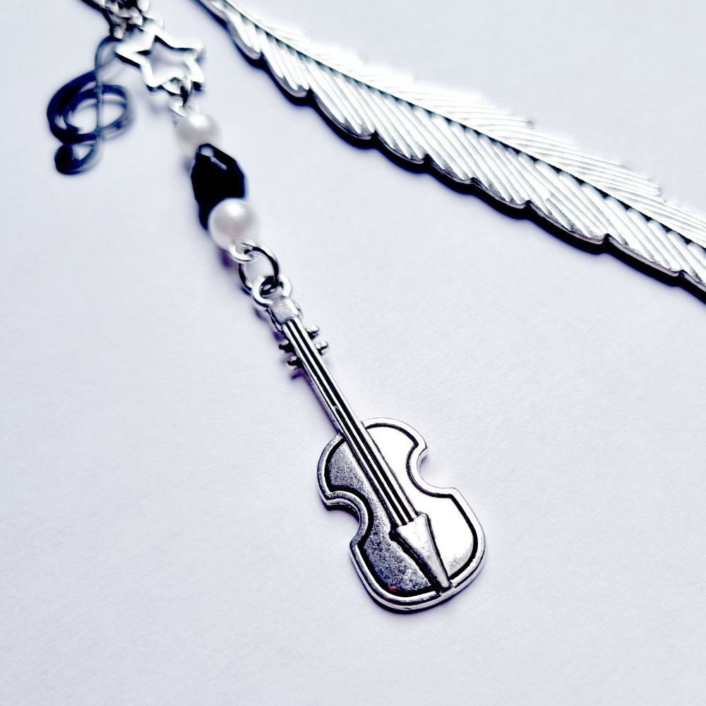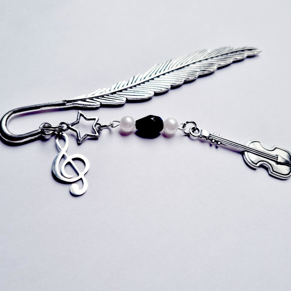 Marque-page avec breloques violon, clé de sol, étoile en forme de plume avec perles noir et blanc. Possibilité de changer la breloque violon par un autre instrument. Me contacter pour cela