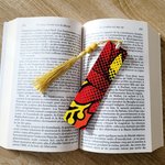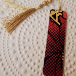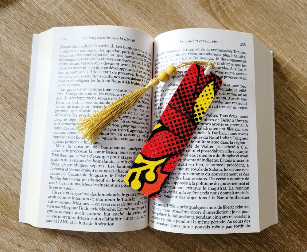 Marque page en bois recouvert de tissu wax , orné d'un joli pompom et de perles de bois.