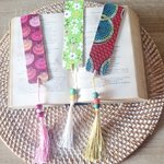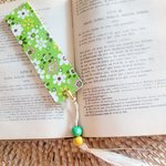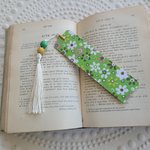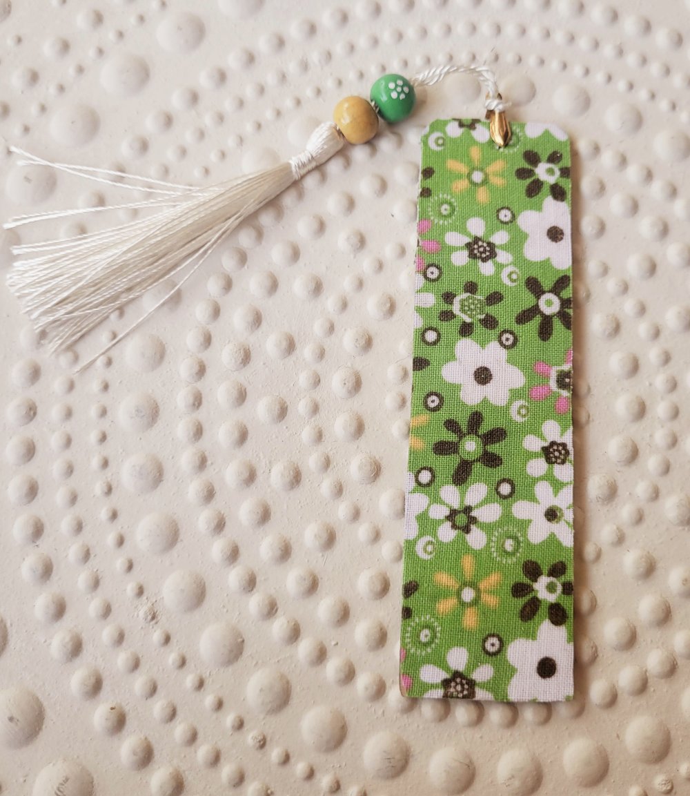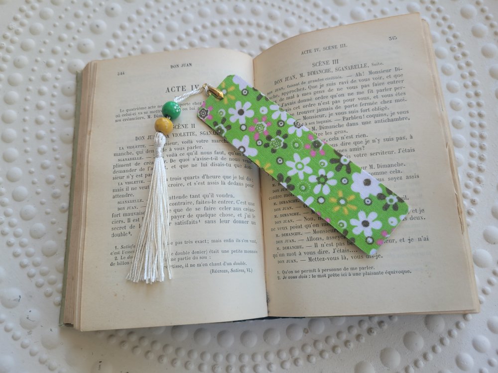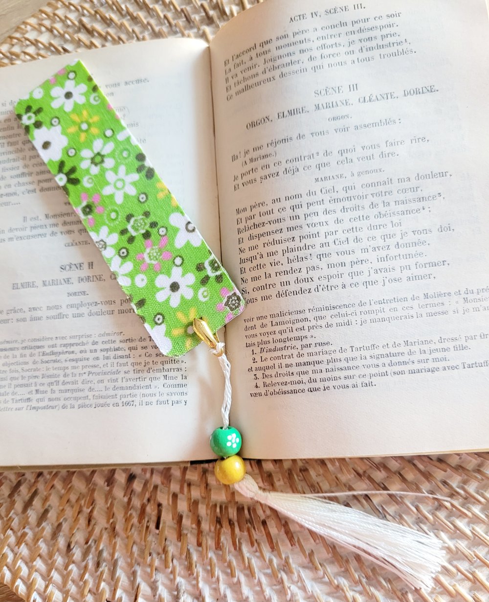 Marque page en bois recouvert de tissu  , orné d'un joli pompom et de perles de bois.
