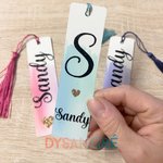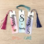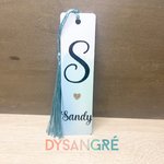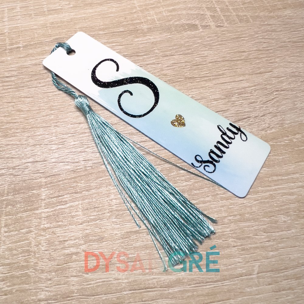 Marques pages avec fond bleu, coeur dorée pailleté et texte noir pailleté