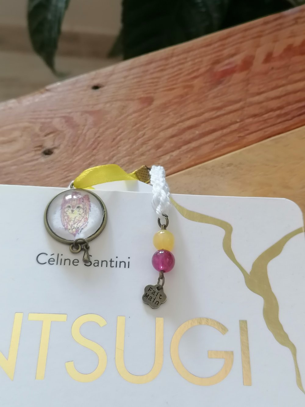Modèle unique fait main ,création artisanale Perles jaune et violette et ruban de satin jaune, cordon au crochet ,cabochon en verre 18 mm avec petit chien 18 mm