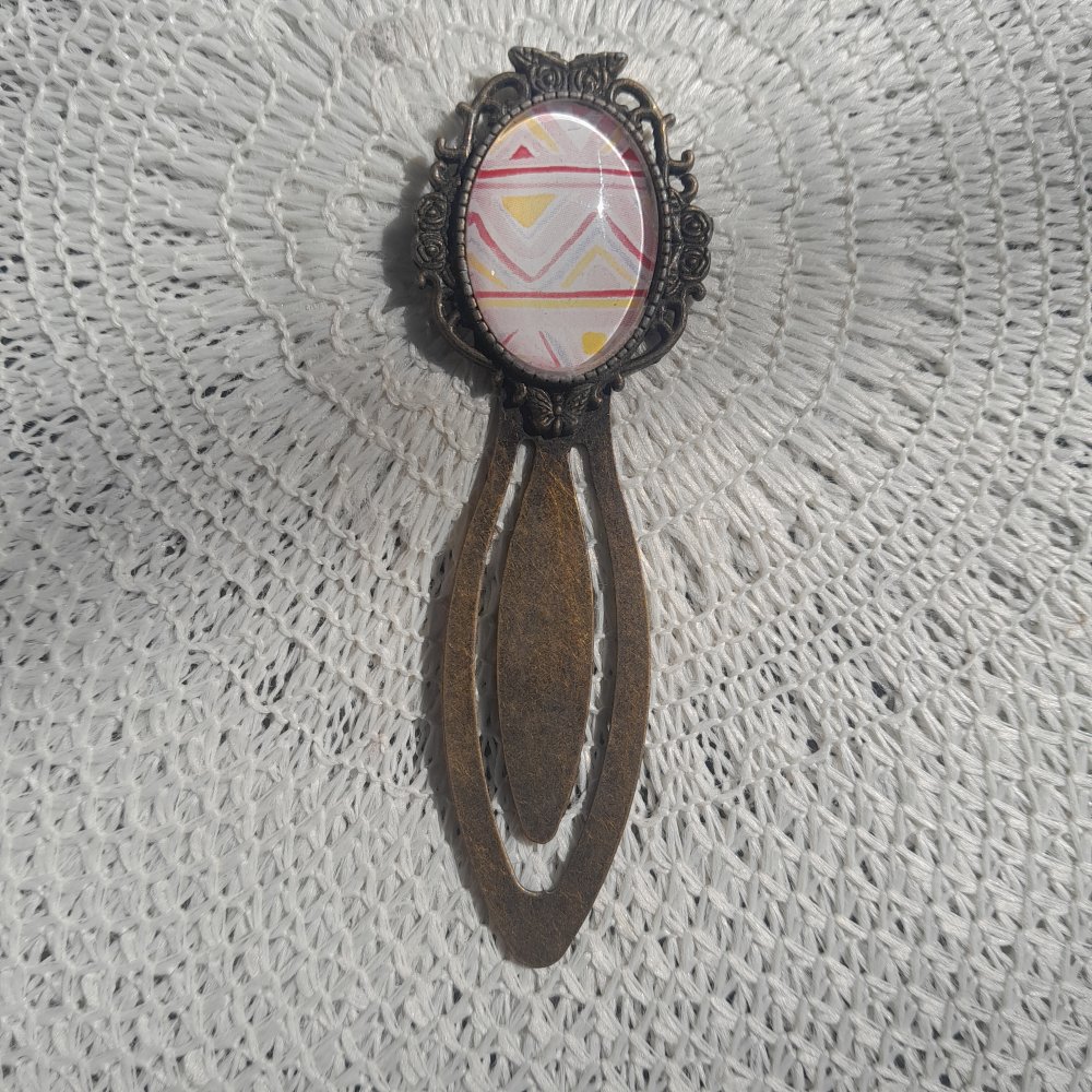 Marque page artisanal image multicolore géométrique avec un cabochon de verre ovale.