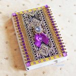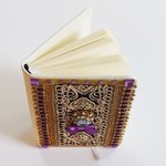 Sur la couverture, un assortiment de riches passementeries, des strass, un noeud satin violet, et un joli cabochon comme un bijou précieux, avec des brillants, des perles et un gros strass en forme de diamant. Superbe effet Baroque !