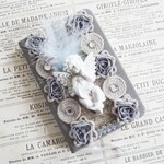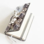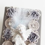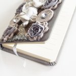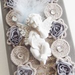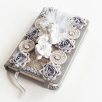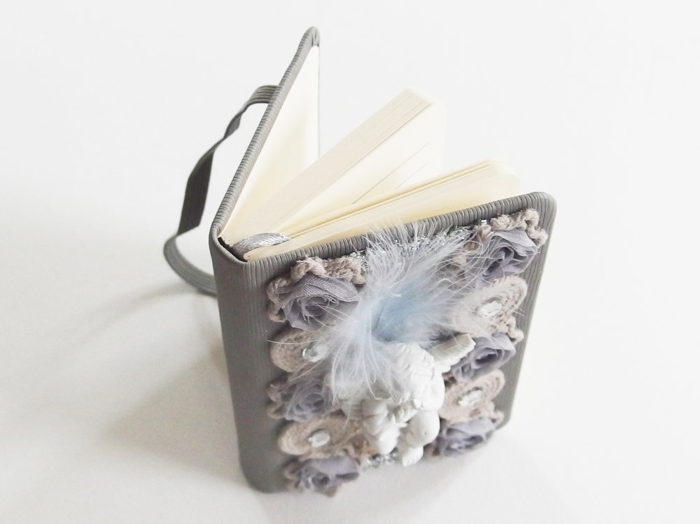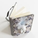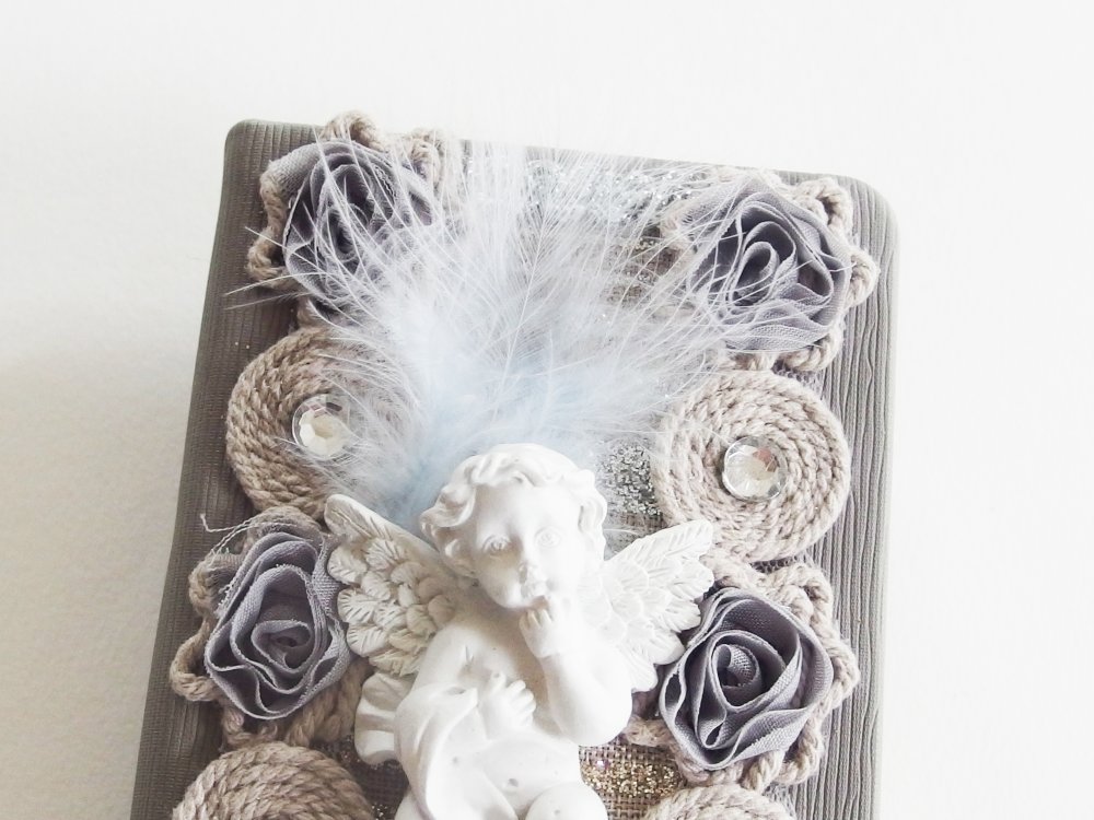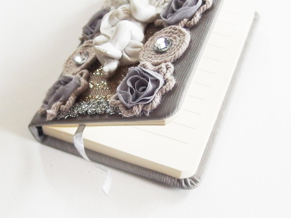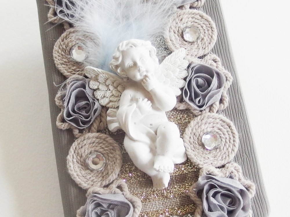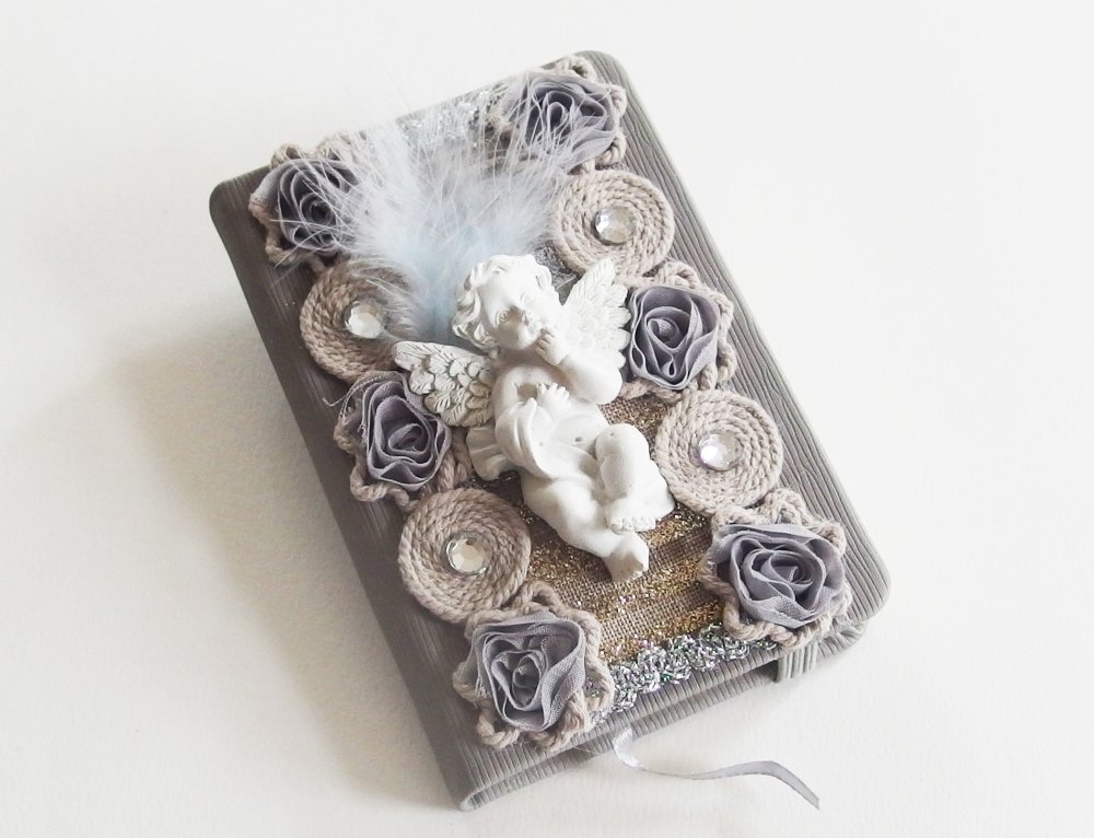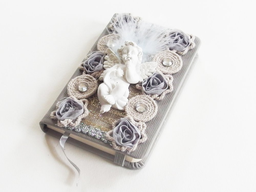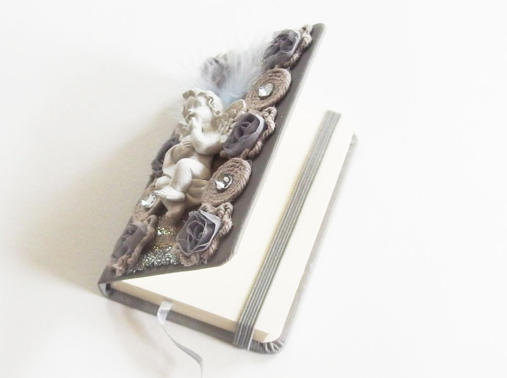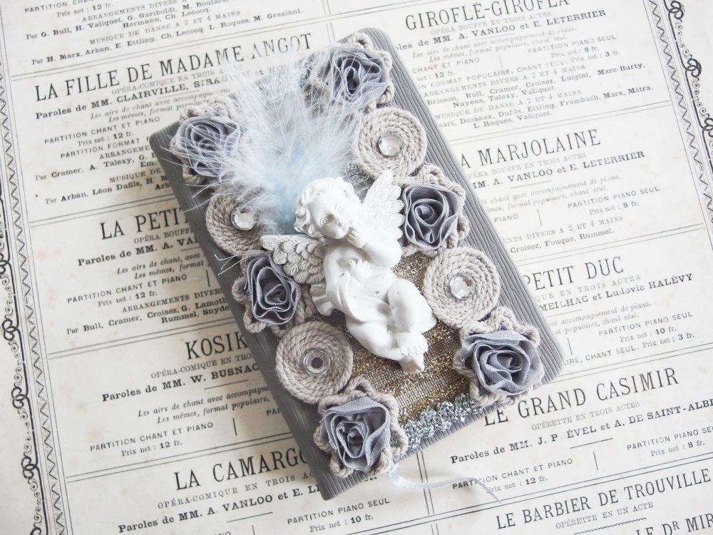 Sur la couverture, un beau tissu lamé or et argent, des compositions florales en tissu et ficelle fine, des strass, et surtout un ravissant petit ange en relief, qui semble pensif bien installé dans son duvet de plumes. Le tout dans une harmonie de tons gris et couleur ficelle.