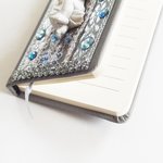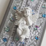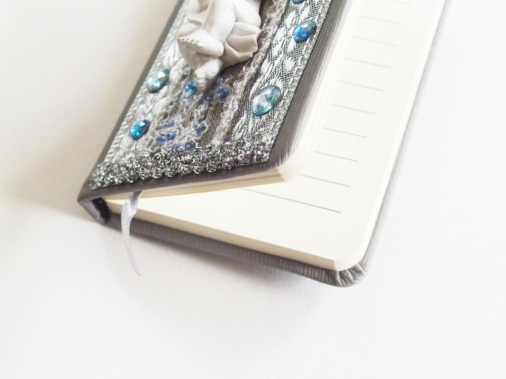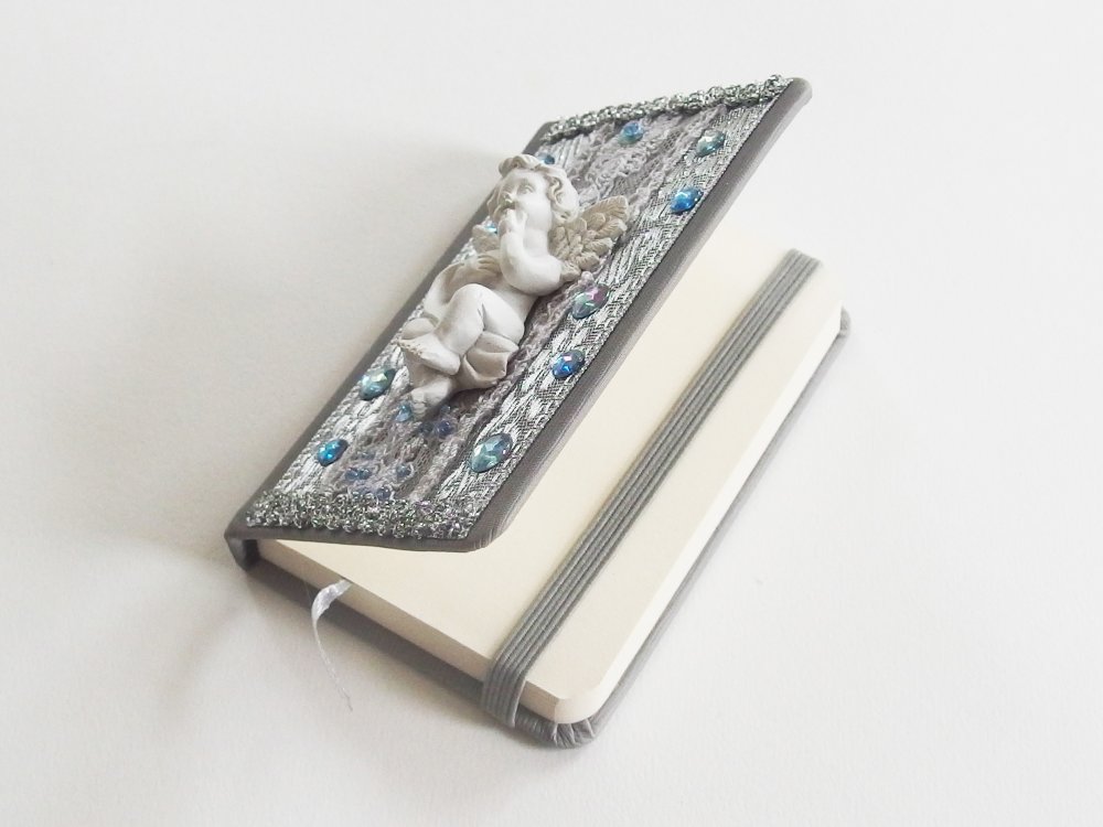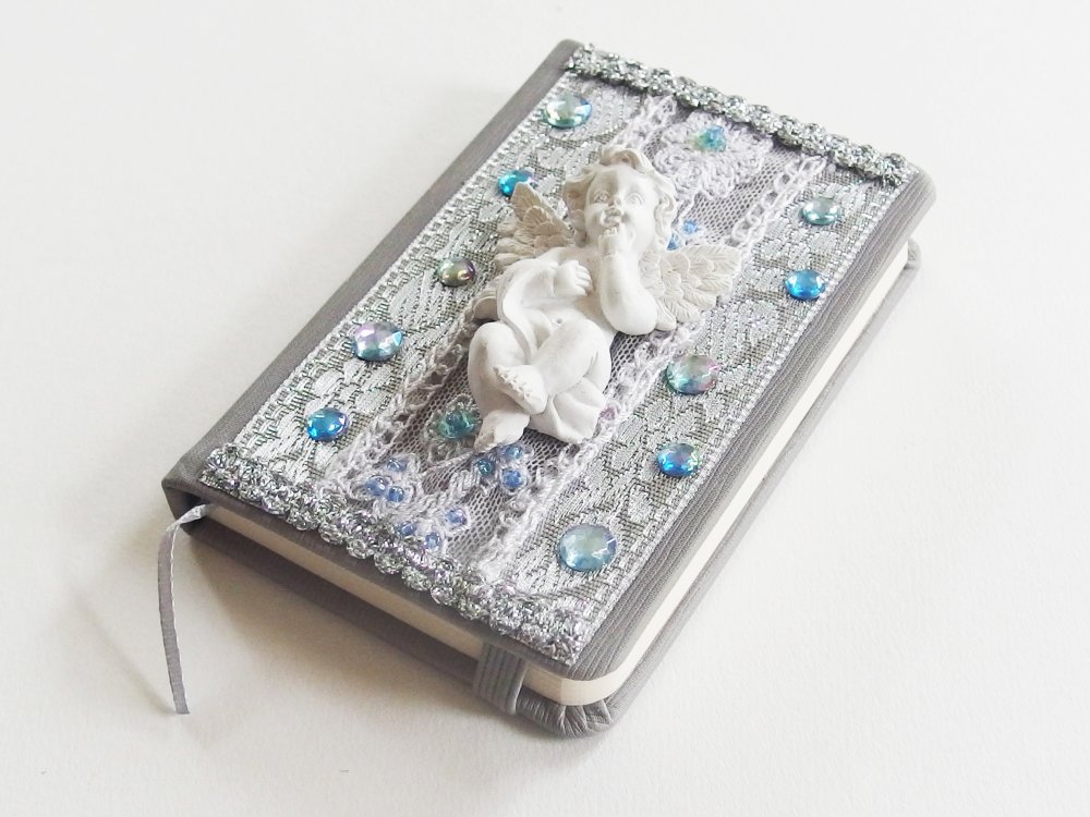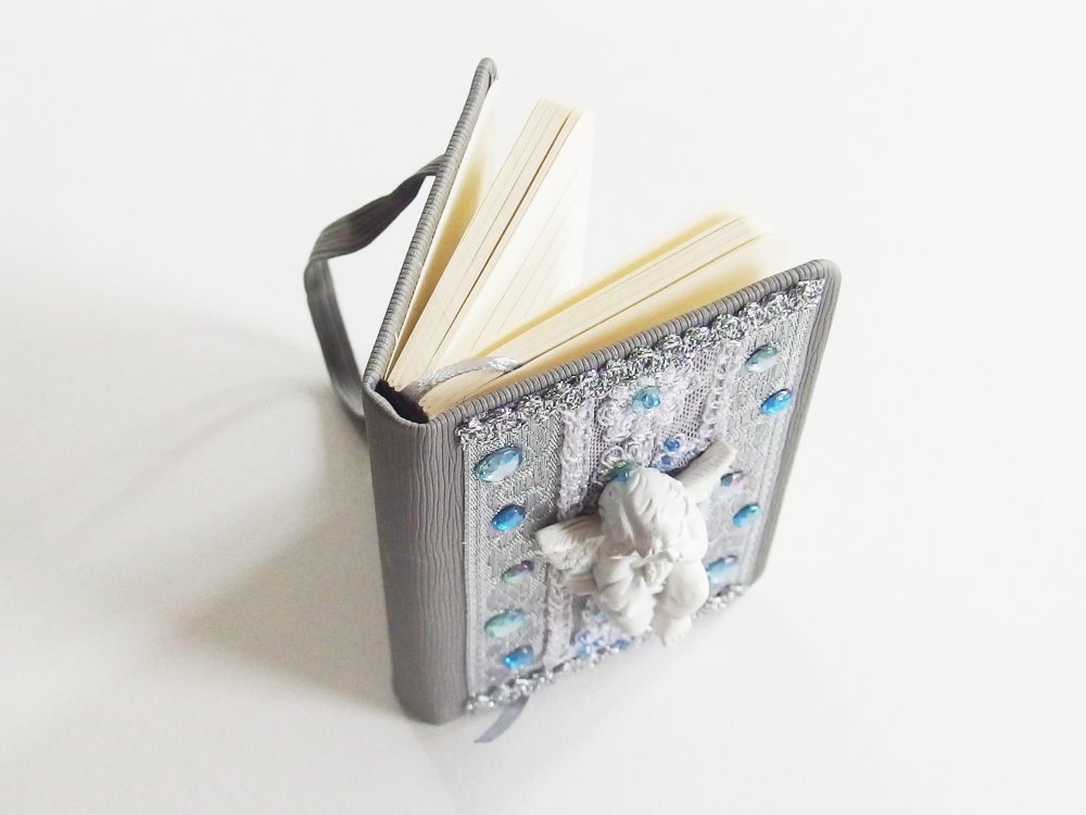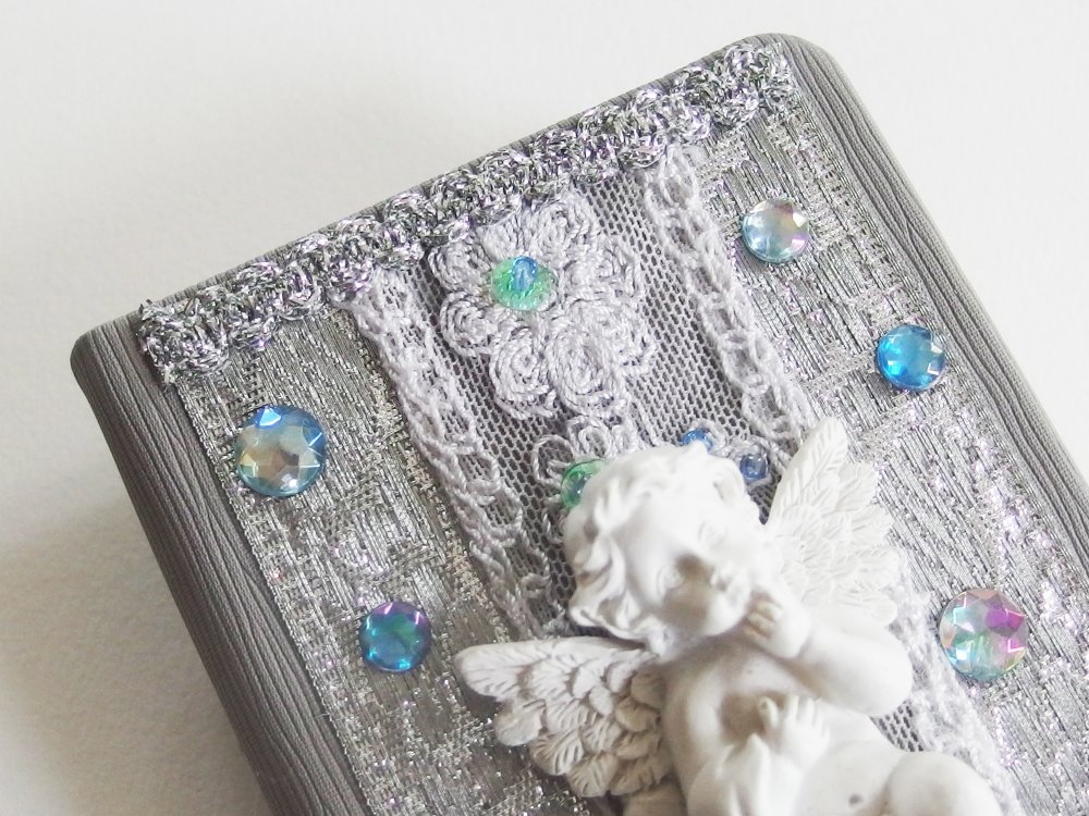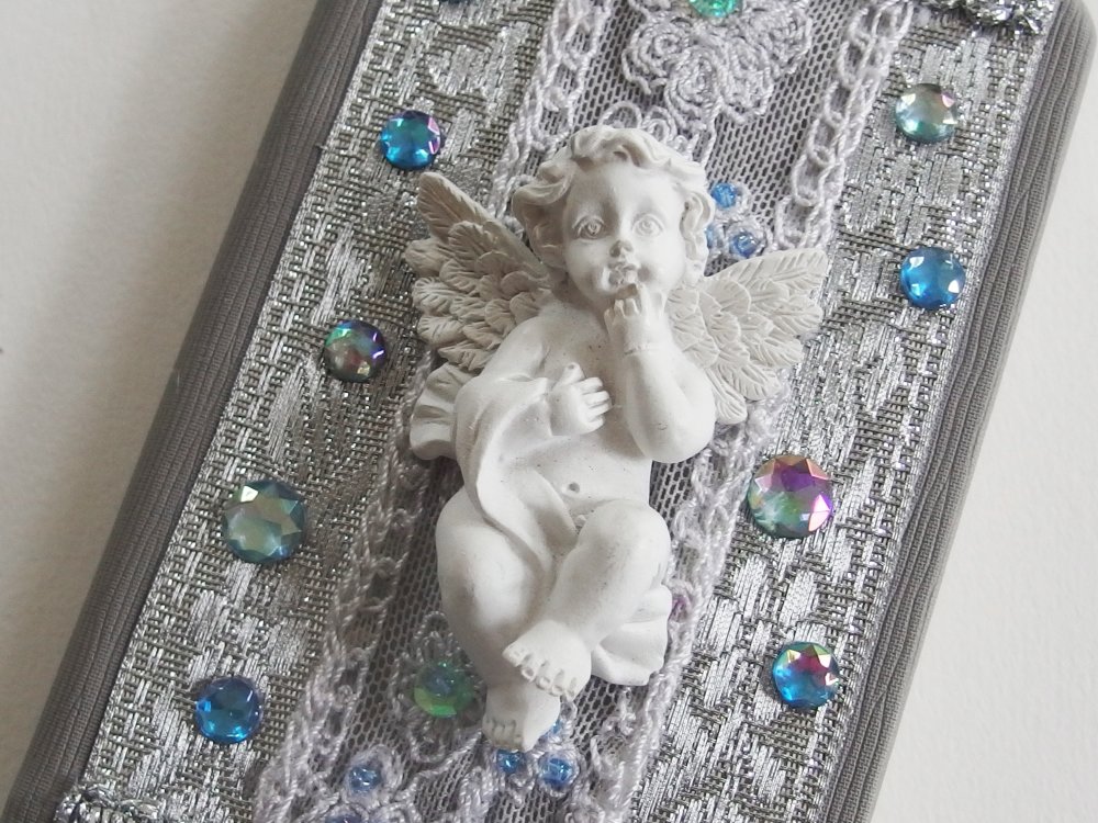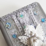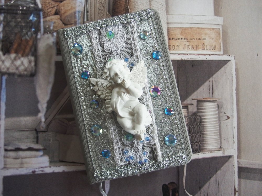 Sur la couverture, des dentelles brodées avec sequins et perles, des rubans lamés et des petits cabochons brillants. Et surtout un ravissant petit ange en relief, tout absorbé dans ses douces pensées. Le tout dans une harmonie toute en blanc, gris clair et argent.