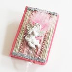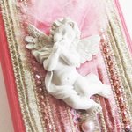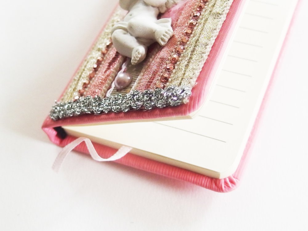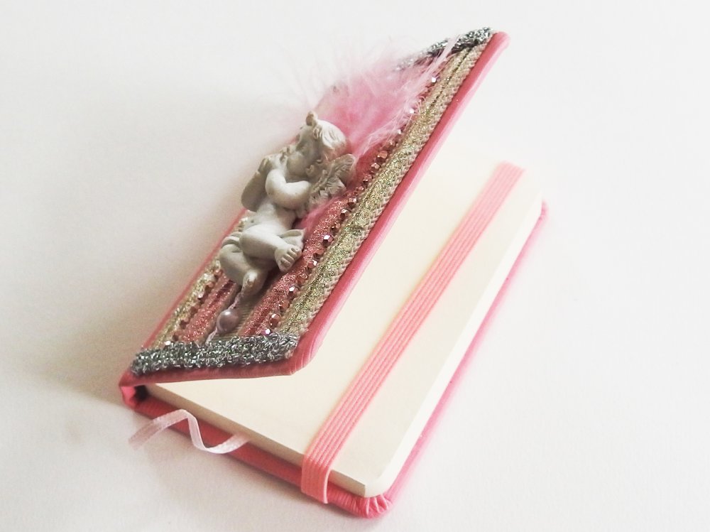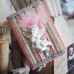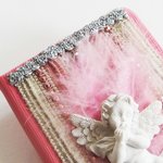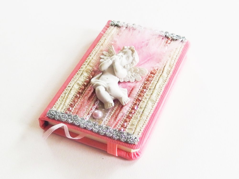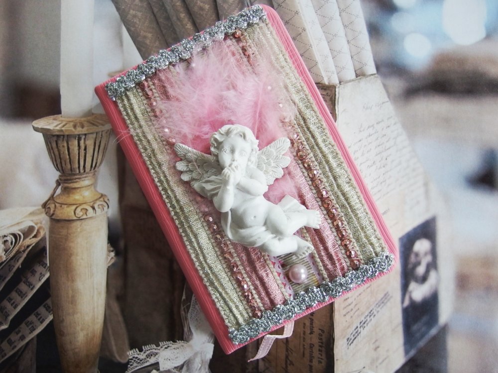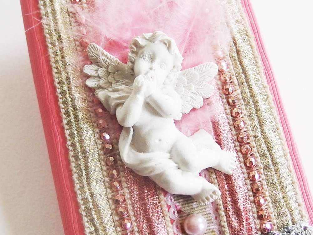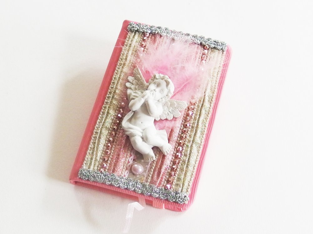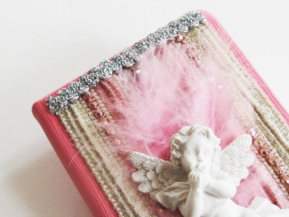 Sur la couverture, des tissus lamés, des perles, des rubans argentés et surtout un ravissant petit ange en relief, pensif dans son duvet de plume. Le tout dans une harmonie couleur ivoire, or et rose.