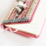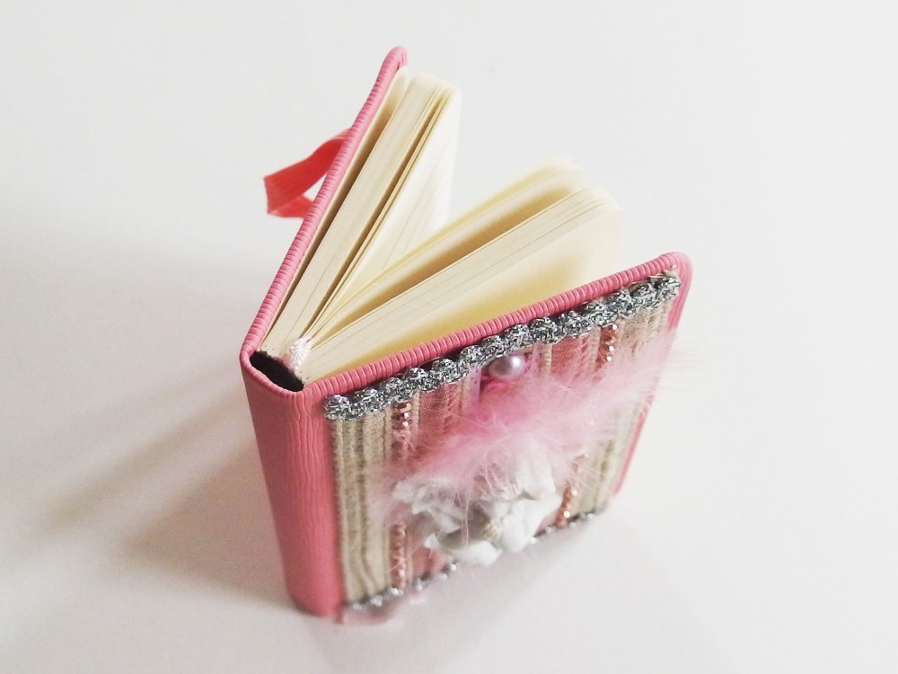 Coins arrondis, avec ruban marque-pages en satin rose et élastique rose également pour maintenir les pages fermées. La couverture est rigide, rose en simili cuir recto-verso et les pages (190 pages / 95 feuilles ) sont en papier lisse couleur ivoire clair et finement lignées.