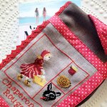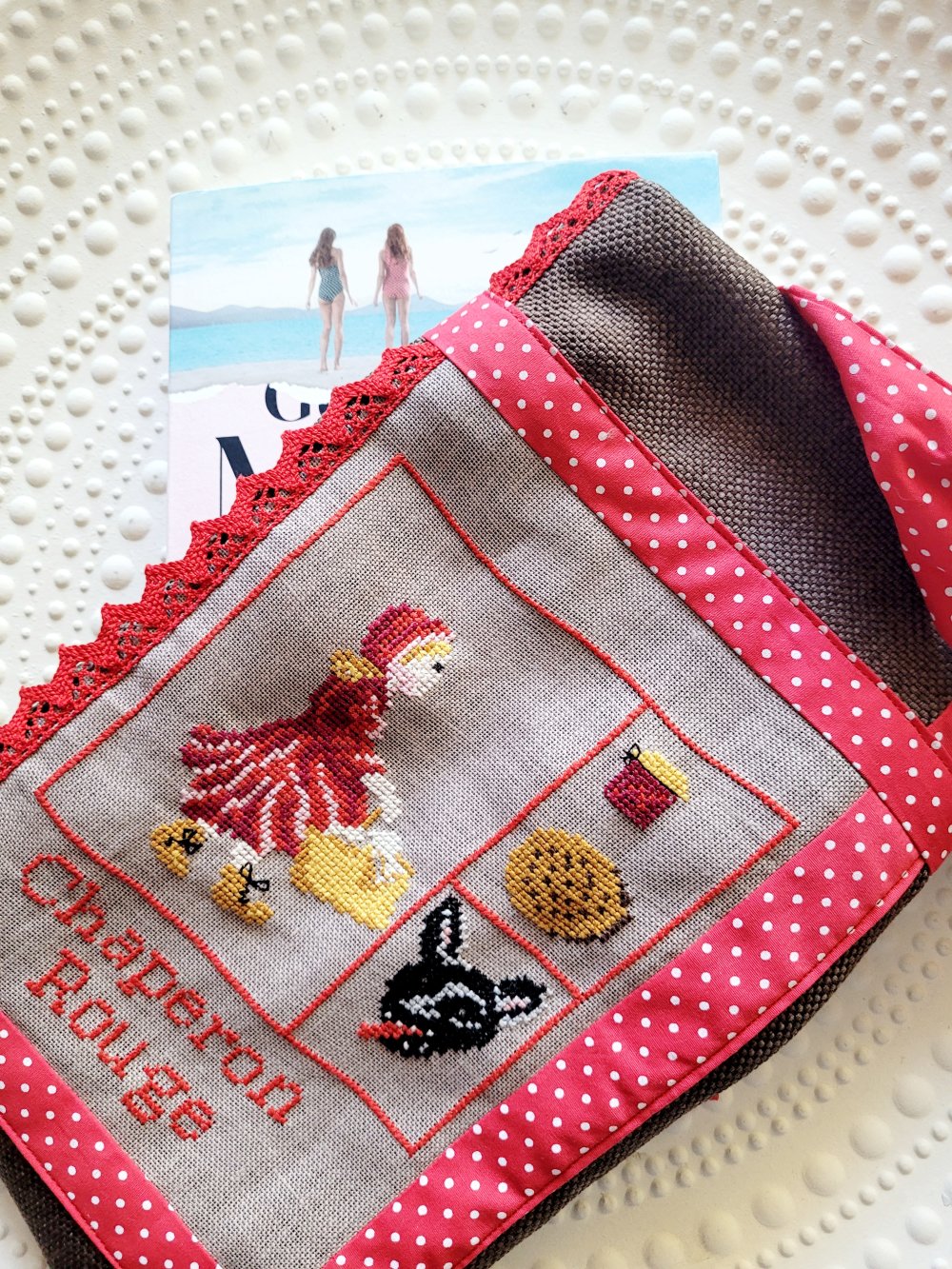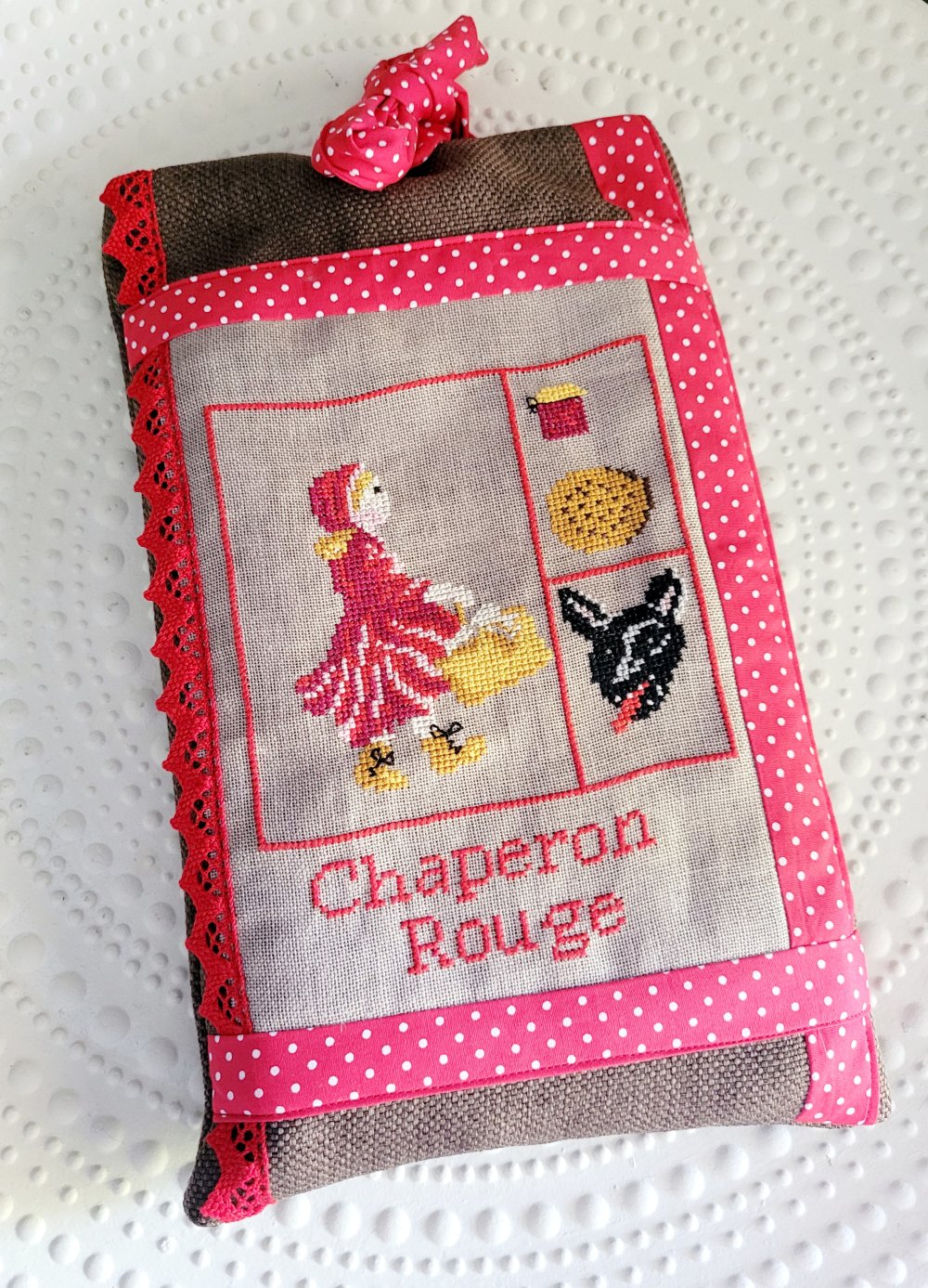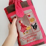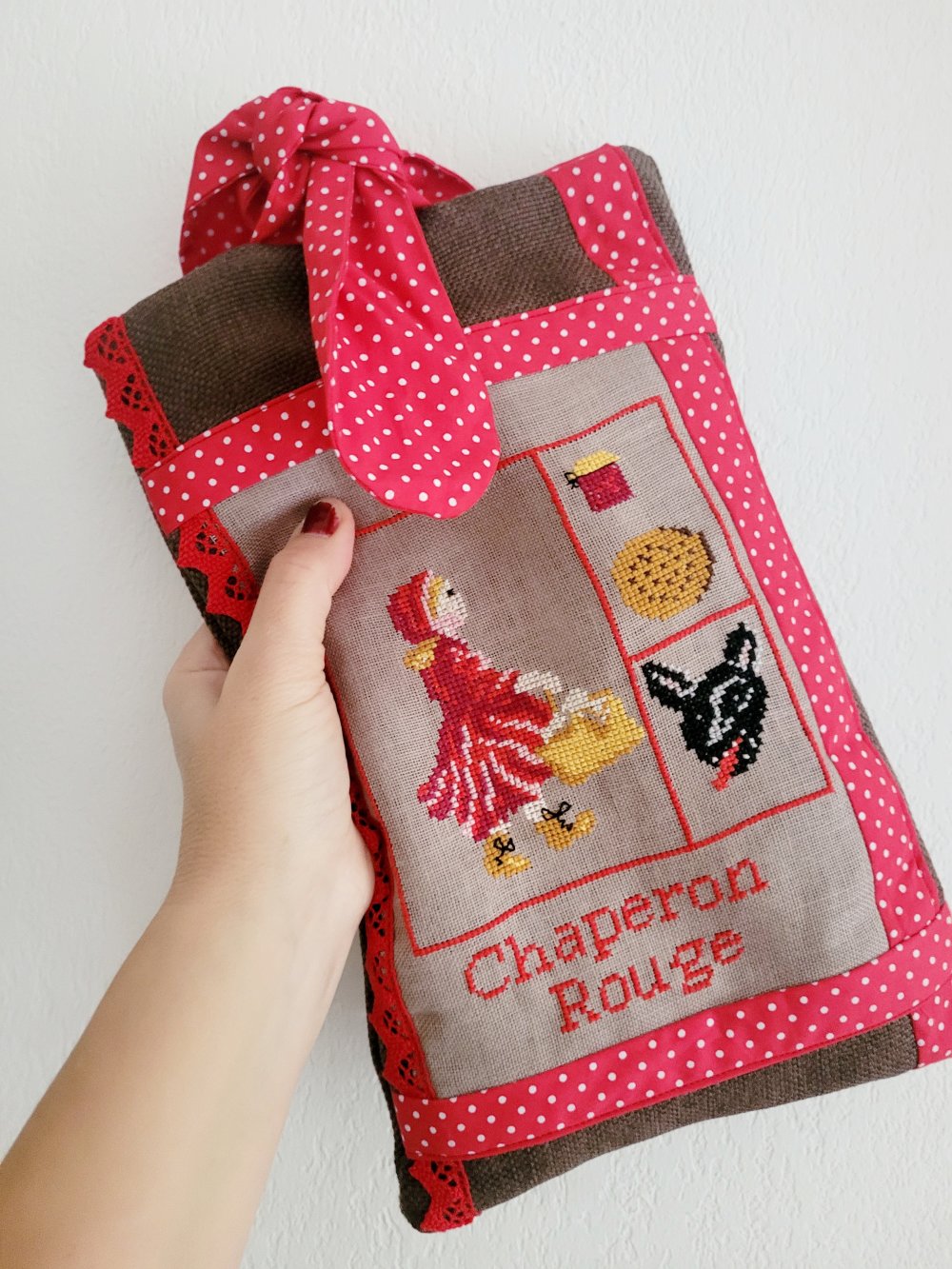 Pochette à livre thème "chaperon rouge" brodé aux points de croix , en coton marron et rouge, ornée de dentelles rouges .Doublée.
