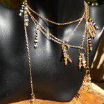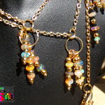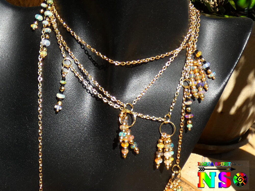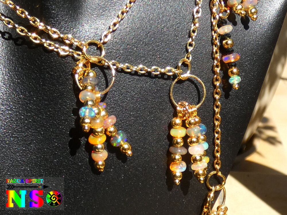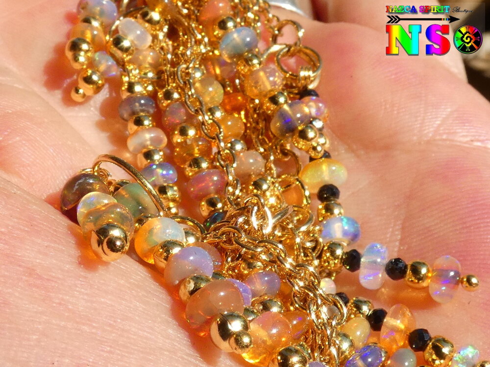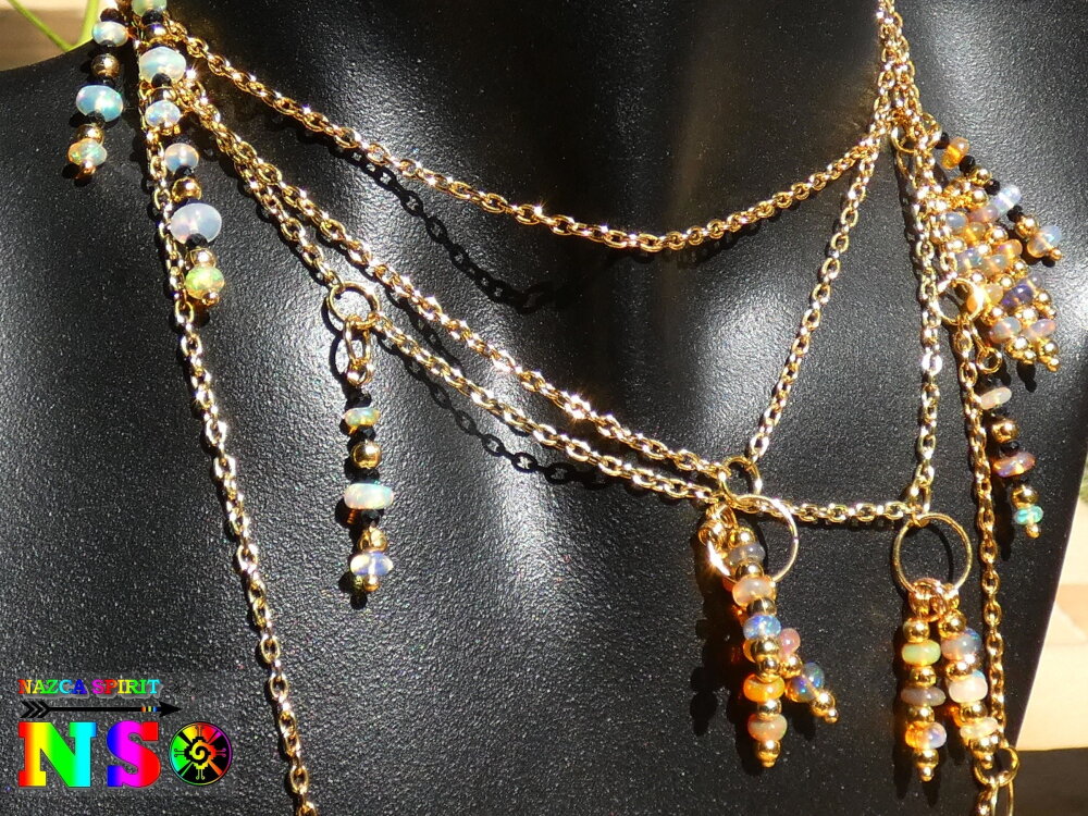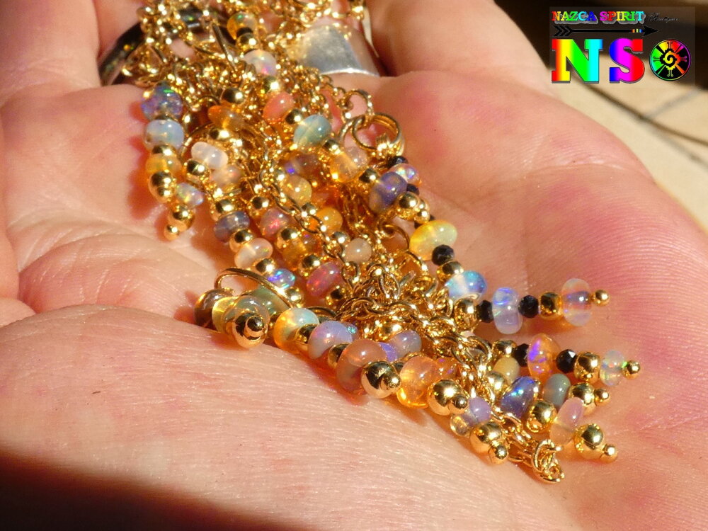 Pour réaliser ce bijou solaire, j'ai utilisé des perles en opales d'Ethiopie de différentes couleurs pour apporter une dimension coloré à cette création unique. Ce sautoir est composé de chaînes en laiton plaqué or 18k reliées par des anneaux en laiton plaqué or 18k. J'ai relié aux anneaux des grappes d'opales et des pendants simples en opale et spinelles noires et perles rondes en laiton plaqué or 18k.