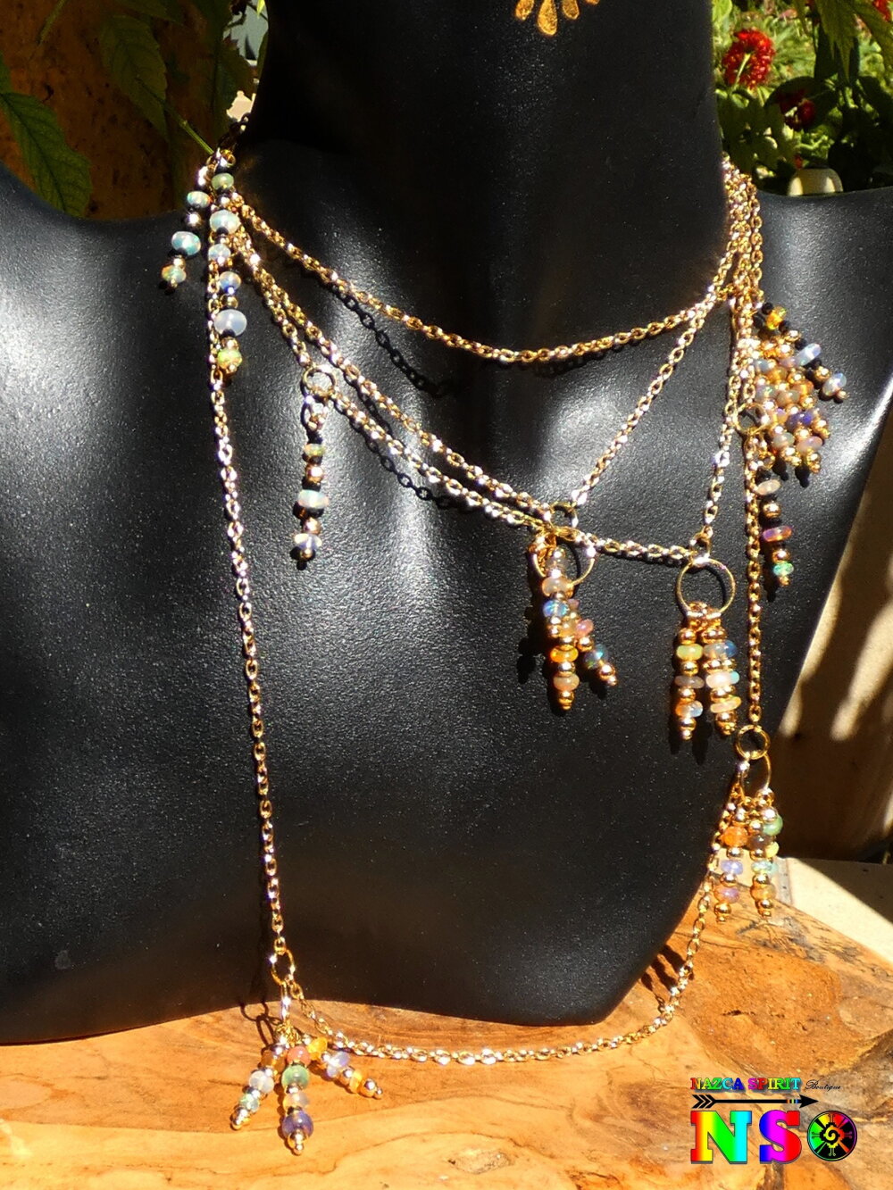 Long Collier Sautoir Chaîne Laiton Plaqué Or, Véritables Perles Opales Ethiopie, Bijoux Précieux Femme, Collier de 140 cm de Long, Fait Main