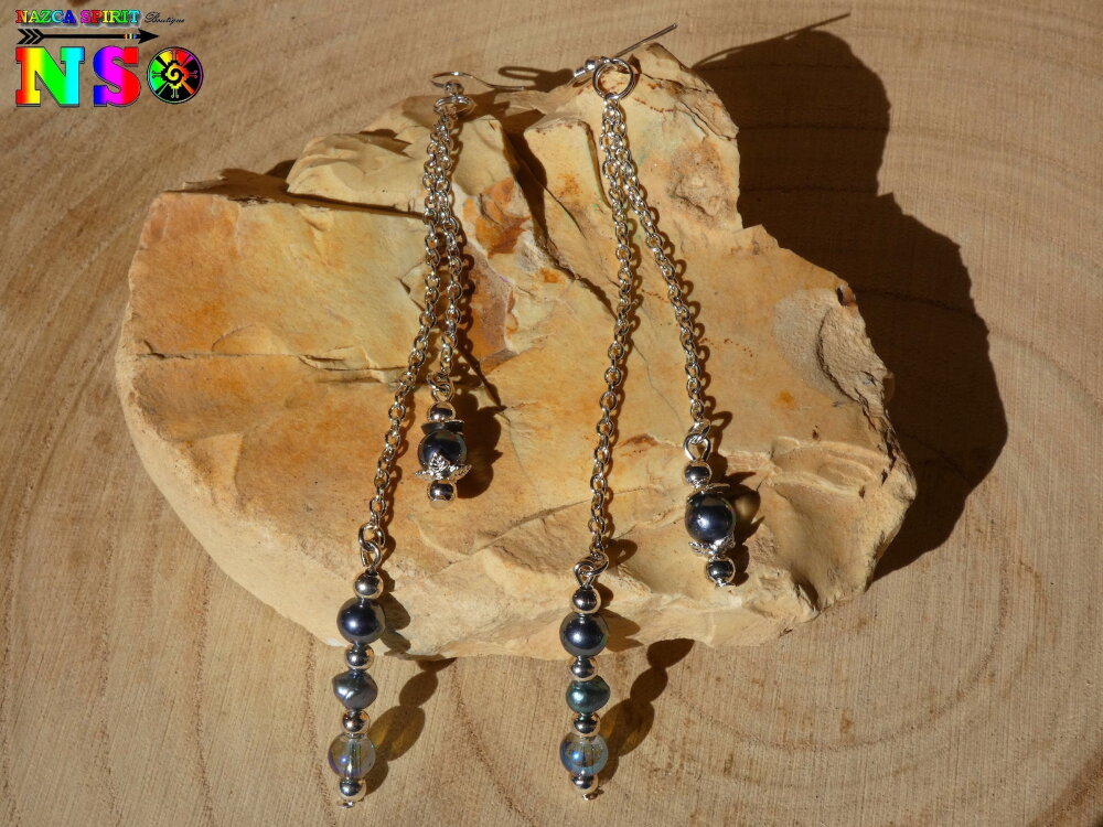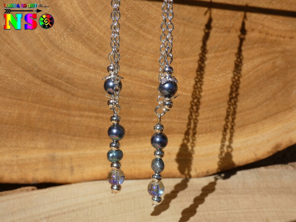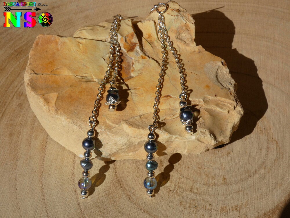 Je vous propose de découvrir une sublime paire de pendants de 13.5 cm ("5.31) de long inspiré des bijoux tahitiens réalisée à partir de 2 chaînes fines en argent 925, de perles de culture noires originaire des Philippines, de perles rondes en cristal Tchèque gris fumé irisé, et de crochets d'oreilles en cuivre plaqué argent ayant subi un traitement hypoallergénique.