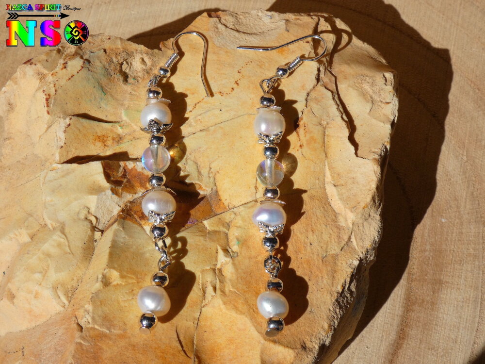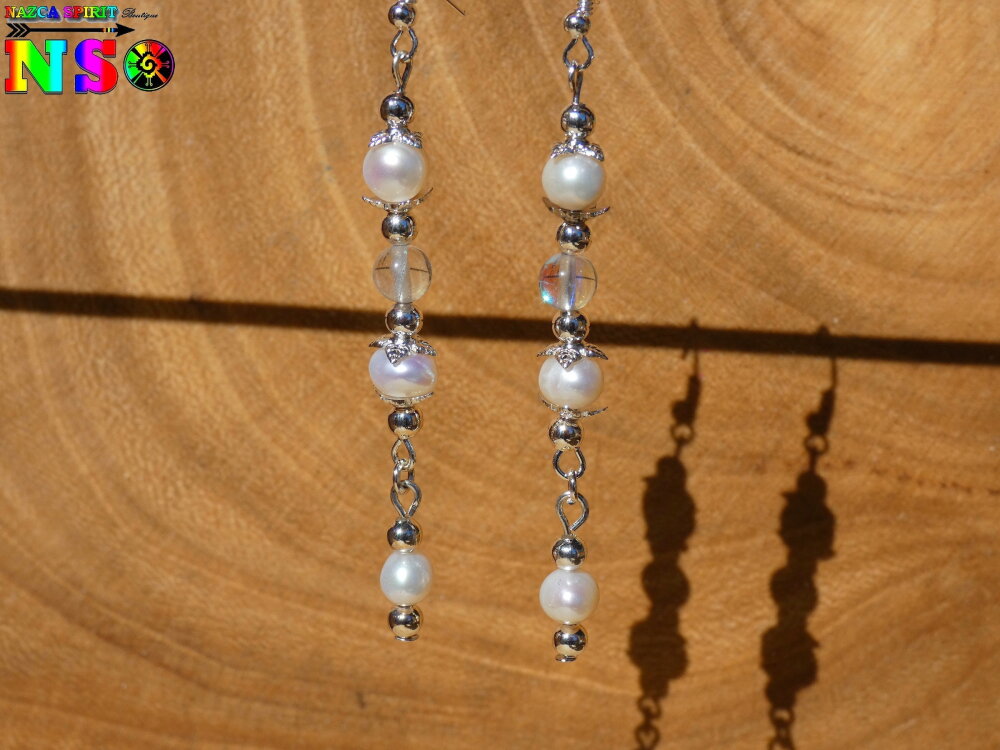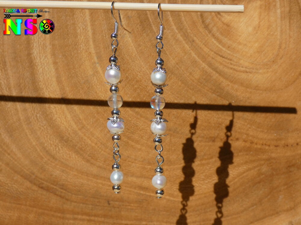 Je vous propose de découvrir une sublime paire de pendants de 8 cm ("3.14) de long réalisés inspirée des bijoux tahitiens à partir de perles de culture blanches originaire des Philippines, de perles rondes en cristal Tchèque aurore boréale imitant la pierre de lune, et de crochets d'oreilles en cuivre plaqué argent ayant subi un traitement hypoallergénique.