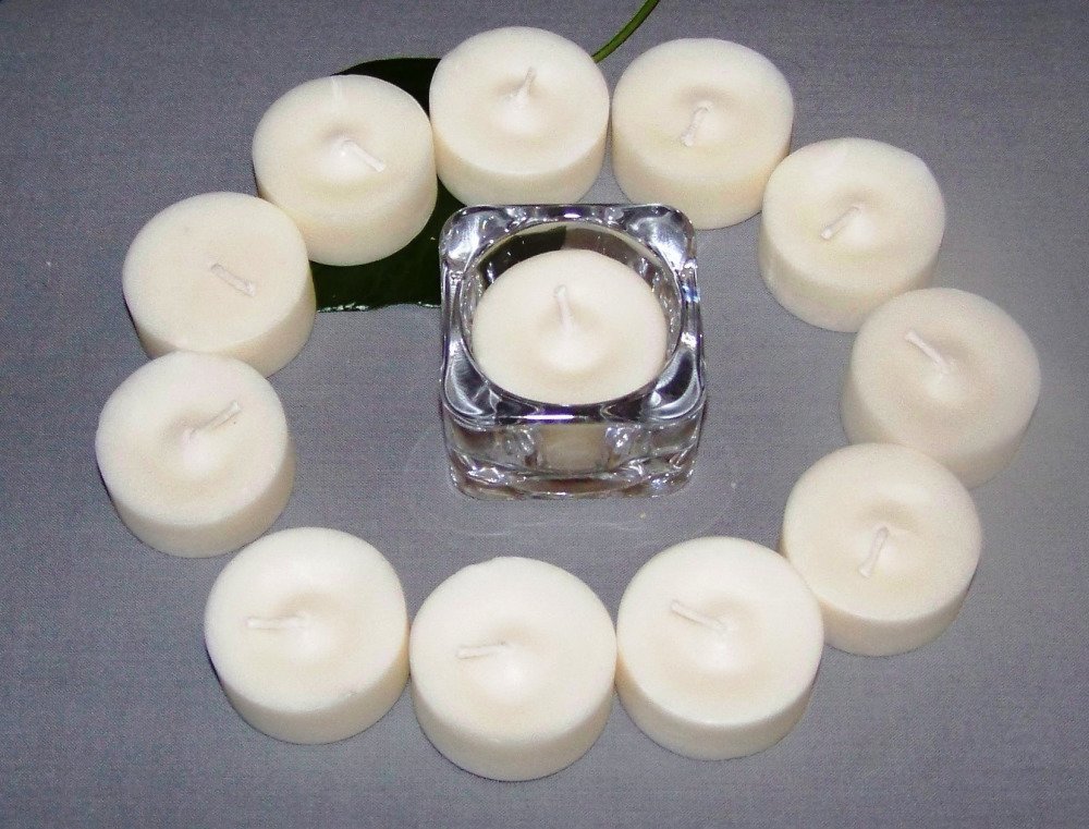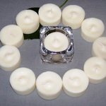 10 Bougies naturelles chauffe plat en cire de soja sans OGM de 3,80 cm de diamètre, 2 cm de hauteur avec une mèche en coton et un photophore en verre de 5 cm de diamètre et 3,20 de hauteur adapté à ces bougies en forme carré. Pour le côté écologique, je n'utilise pas de support métallique. Je fais couler de la cire dans un moule que je laisse refroidir, ensuite je mets une mèche.