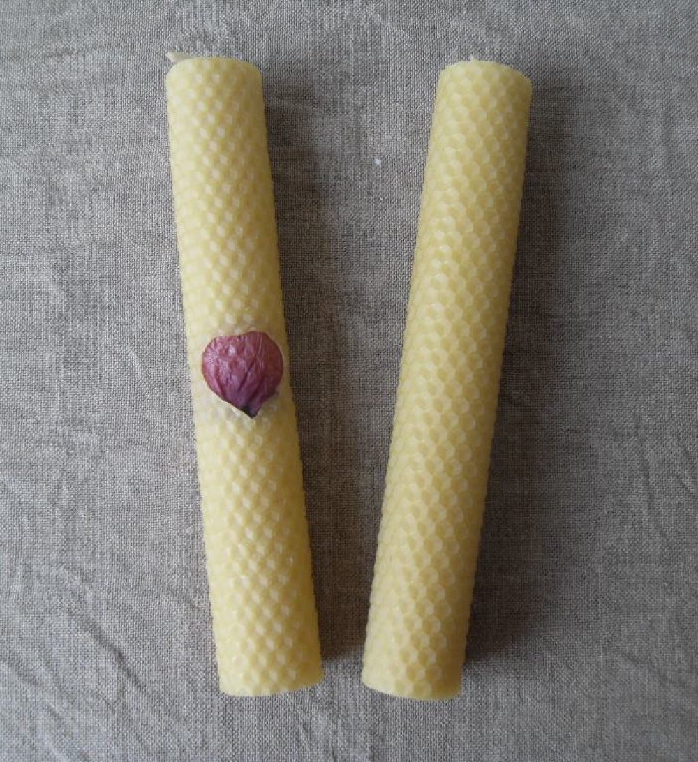 2 Bougies naturelle en pure cire d'abeille gaufrée donc une avec un cœur sculté