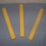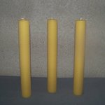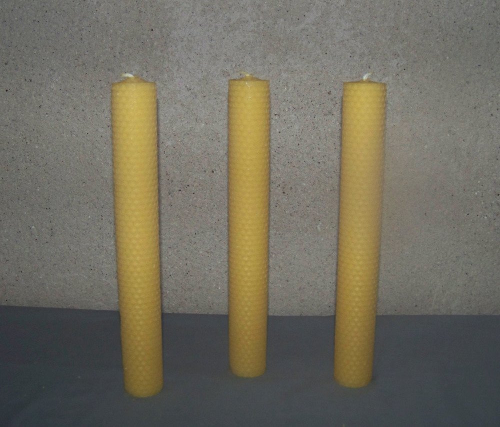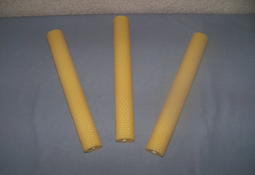 3 Bougies Naturelles Gaufrées en Pure Cire d'Abeille - Chaque bougie hauteur 26 cm diamètre 3 cm durée de consumation environ 14 heures - roulées à la main par mes soins avec une mèche en coton - écologique. Il peut y avoir une variation de couleur de la cire d'abeille selon les fleurs butinées.