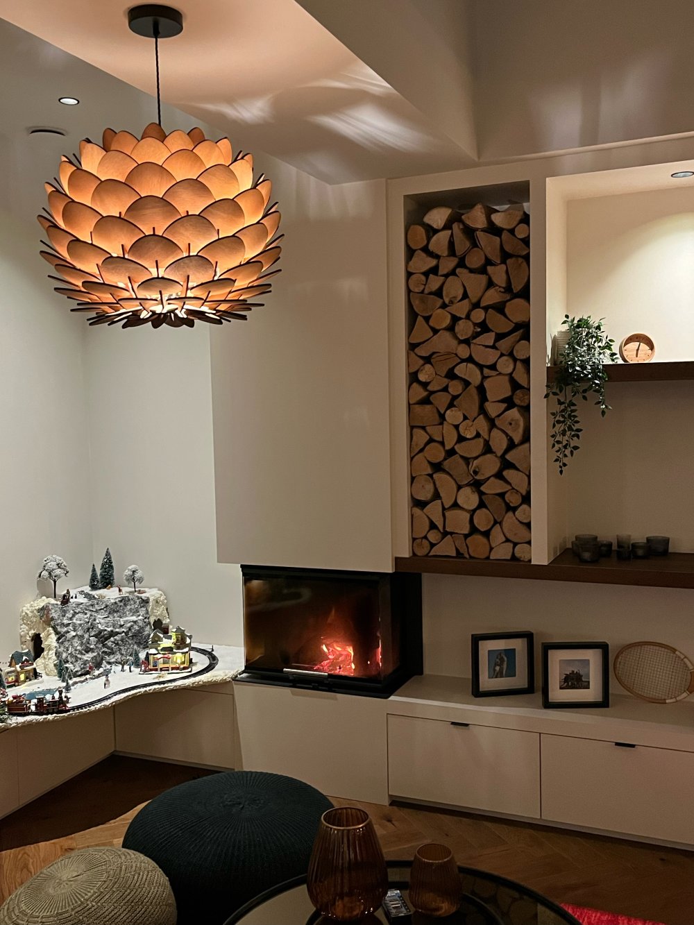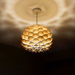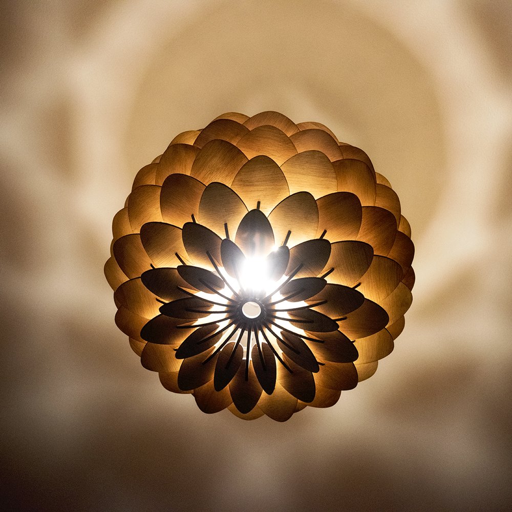Ce luminaire donne un éclairage doux et tamisé, il créé une ambiance chaleureuse, l'ombre des feuilles se reflète au plafond.