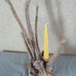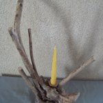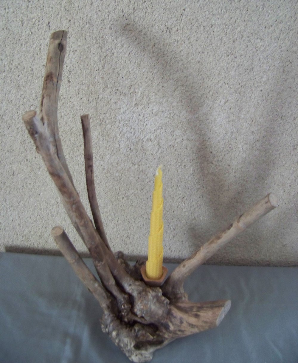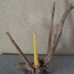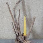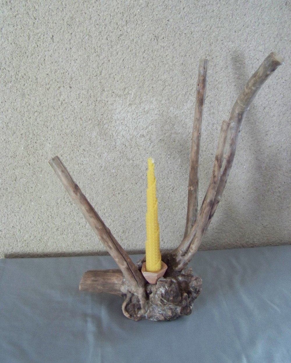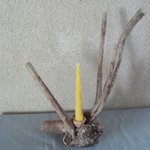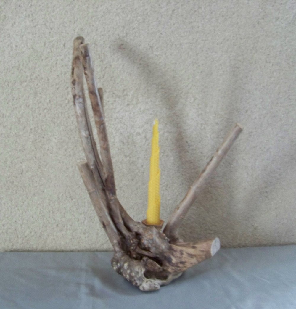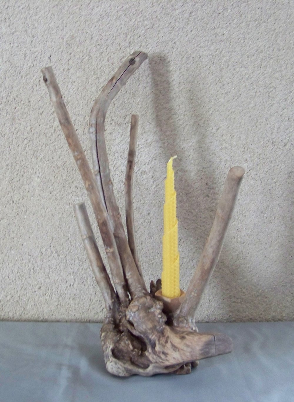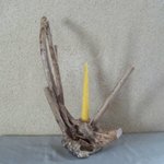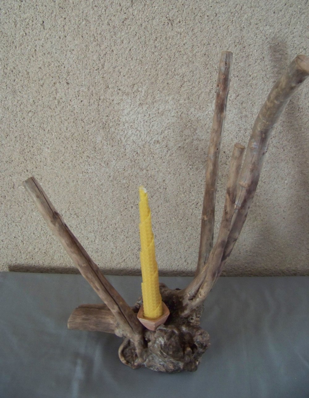Un bougeoir fait avec une racine de bois flotté nettoyée, poncée, cirée avec un support en poterie et une bougie torsadée naturelle en pure cire d’abeille.