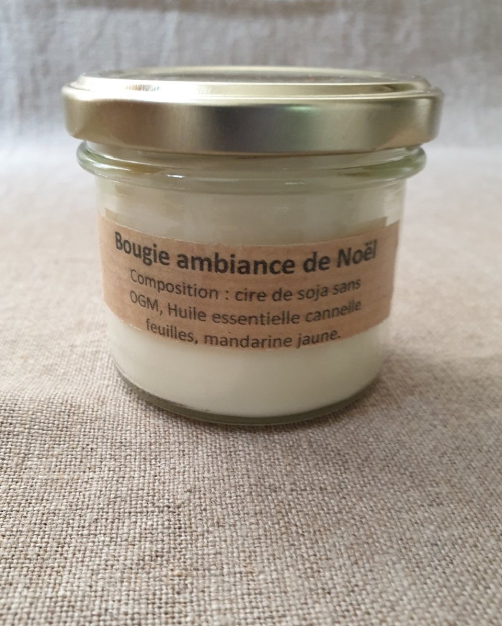 Bougie Ambiance de Noël Composée : de cire de soja sans OGM- Huile essentielle des feuilles de cannelier, épicée et proche du clou de girofle connue pour ses propriétés purifiantes – Huile essentielle de mandarine jaune qui est un puissant calmant et relaxant.Toutes mes bougies avec des huiles essentielles bio sont fabriquées avec de la cire de soja sans O.G.M car elle a un point de fusion bas et donc restitue au mieux les H.E. - avec une mèche en coton ou coton (non traité), âme en papier . Pot de 120 ml - Hauteur 5.80 cm - Diamètre 6.80 cm. Pot plein environ 200 g.