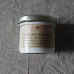 Bougie Anti Moustique Composée : de cire de soja - Huile végétale Neem Margousier reconnue pour avoir des propriétés insectifuges - Huile essentielle de Citronnelle reconnue pour repousser les insectes et purifie l’air par ses qualités antiseptiques – huile essentielle de Géranium Egypte et d’Eucalyptus citronné éloignent les insectes, vitamine E. Toutes mes bougies avec des huiles essentielles bio sont fabriquées avec de la cire de soja sans O.G.M car elle a un point de fusion bas et donc restitue au mieux les H.E. - avec une mèche en coton ou coton (non traité) âme de papier. Pot de 120 ml - Hauteur 5.80 cm - Diamètre 6.80 cm. Pot plein environ 200 g.